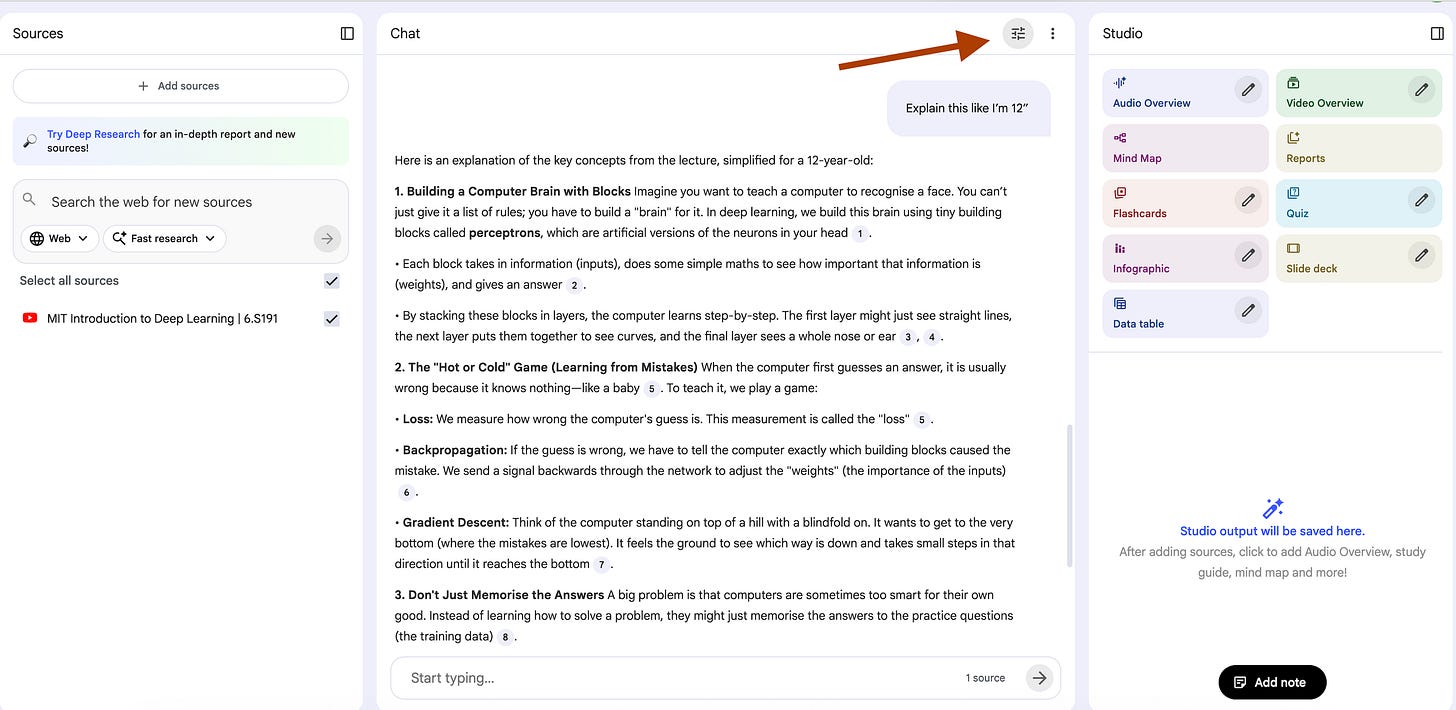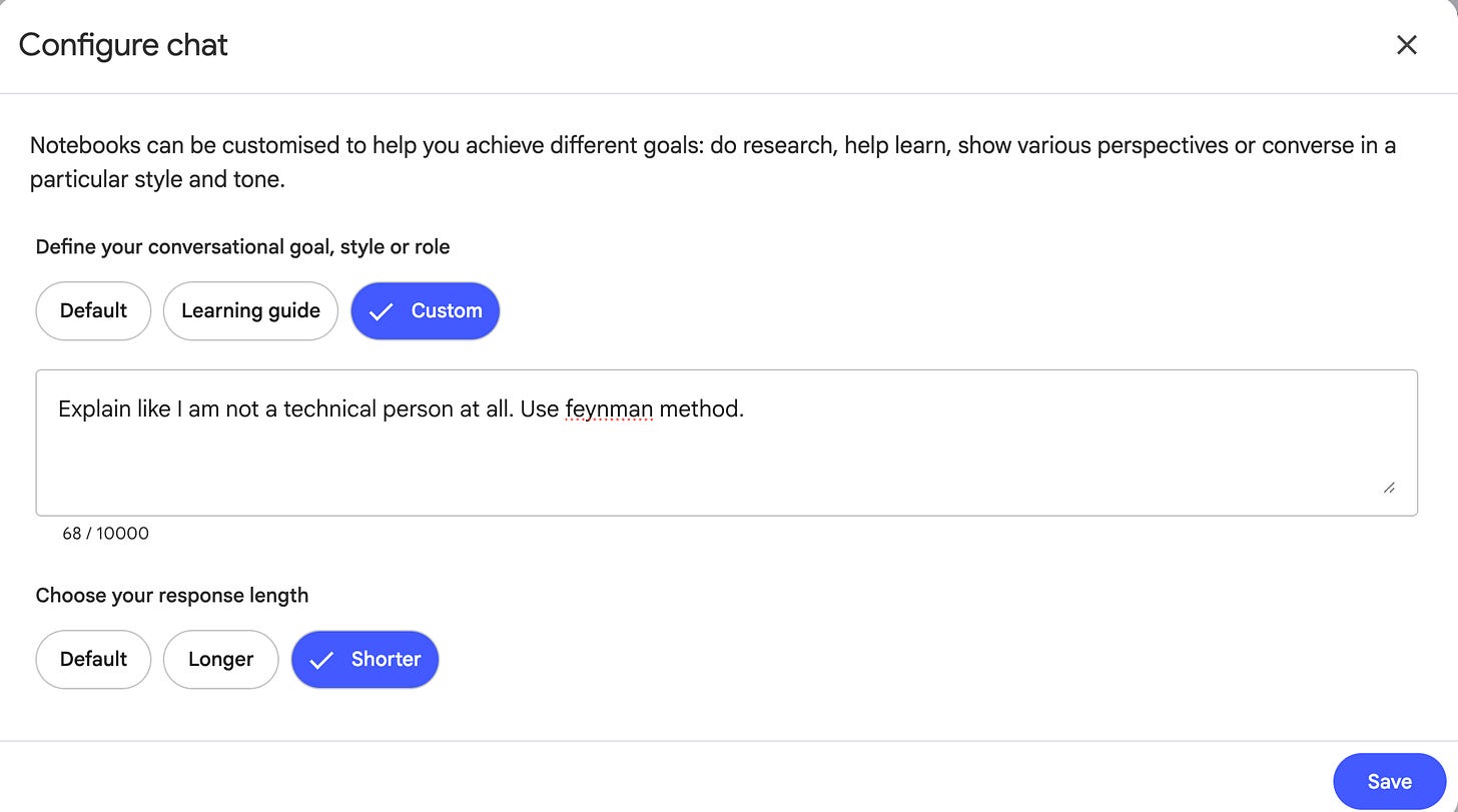 You understand how it works right? But let’s customize the NotebookLM a little bit more. Click on here.