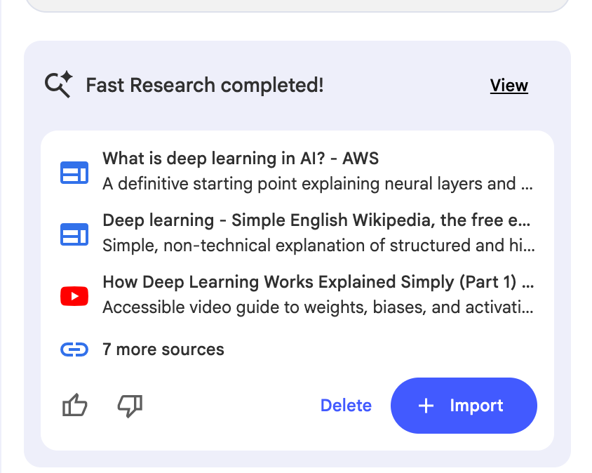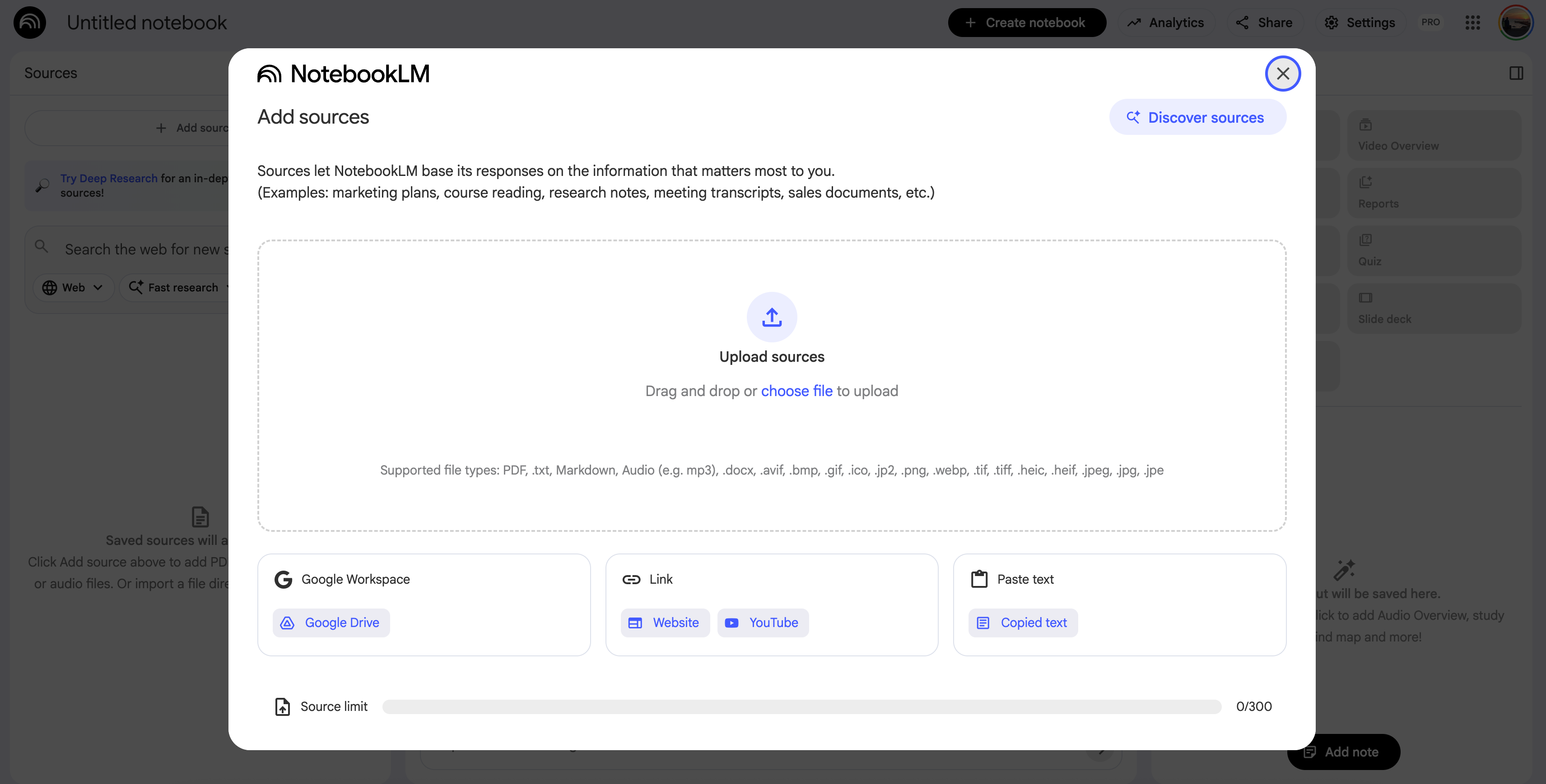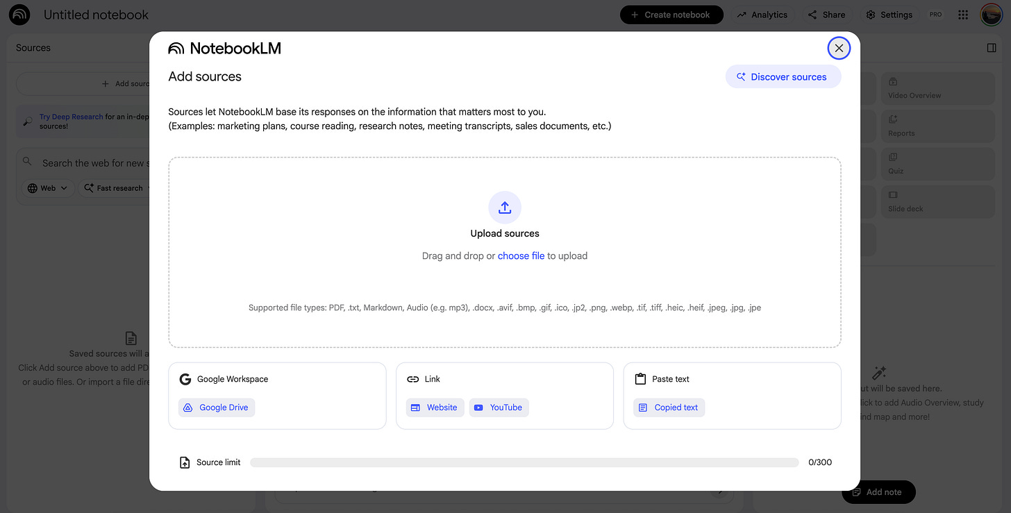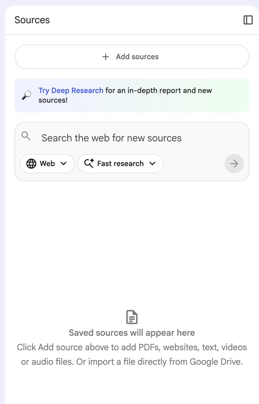 You can add PDF, Google Document, text, YT Videos or even do a deep research and add results.