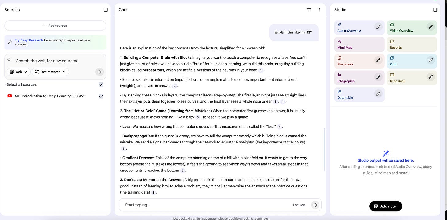 To test this prompts and methods, let’s train a notebookLM from MIT’s deep learning course, here.