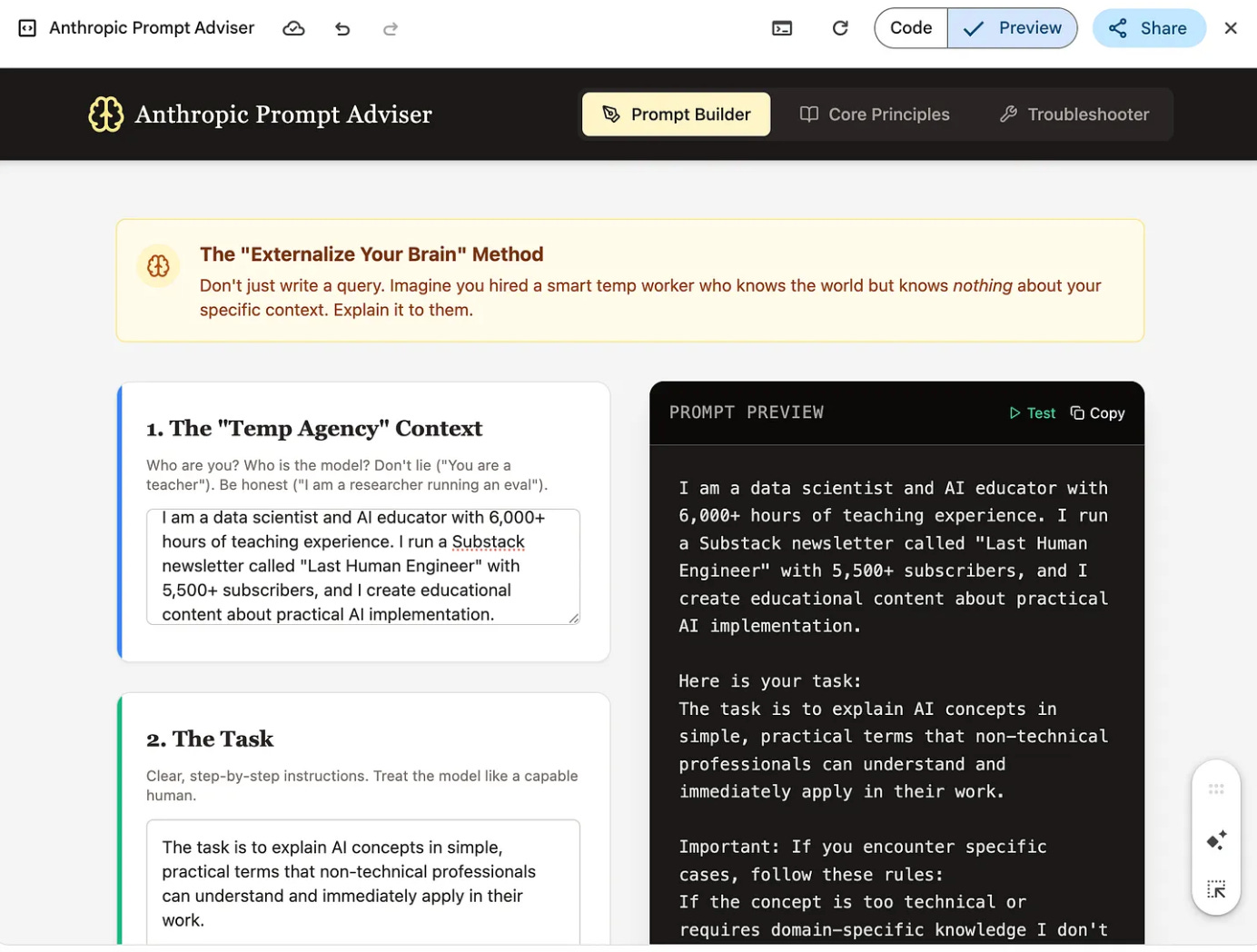 An AI app trained on Anthropic’s official Prompt Engineering course. It builds, fixes, and improves your prompts using techniques from the engineers who created Claude.
