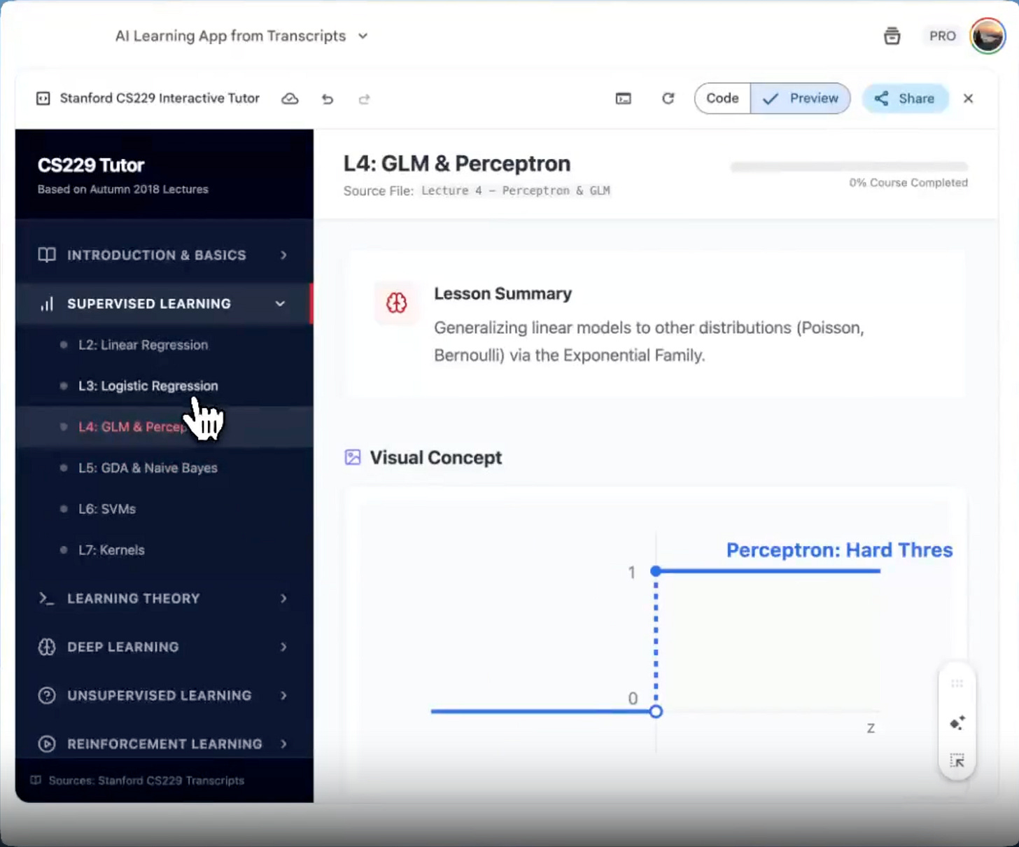 A personalized learning app built from Stanford’s Machine Learning course. It teaches concepts, uses flashcards for memorization, runs interactive quizzes, and generates infographics.