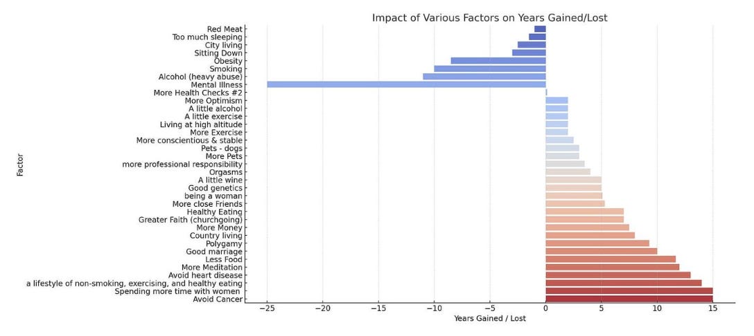 Mental Engagement and Companionship: Activities like meditation and spending time with women are linked to significant increases in longevity.