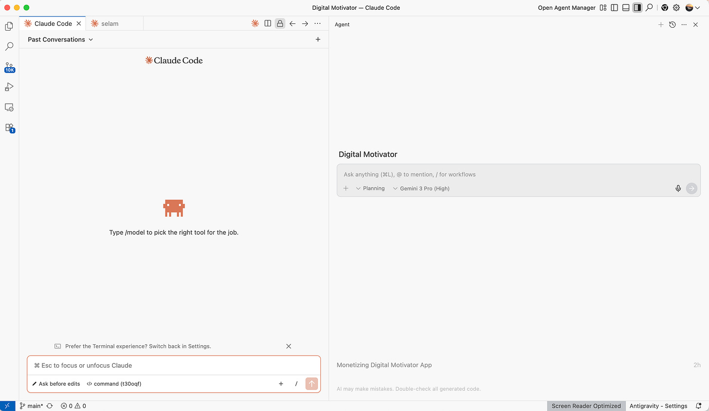 For instance, I’ve built my frontend using Antigravity, but Claude Code let me build the backend, perfect harmony.