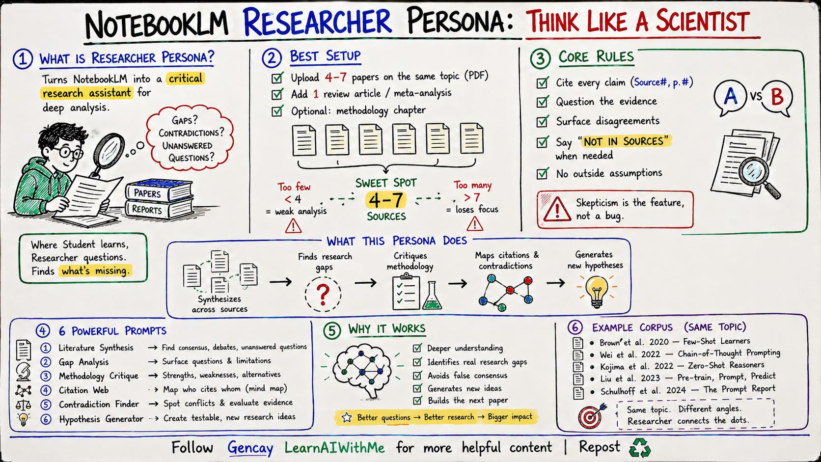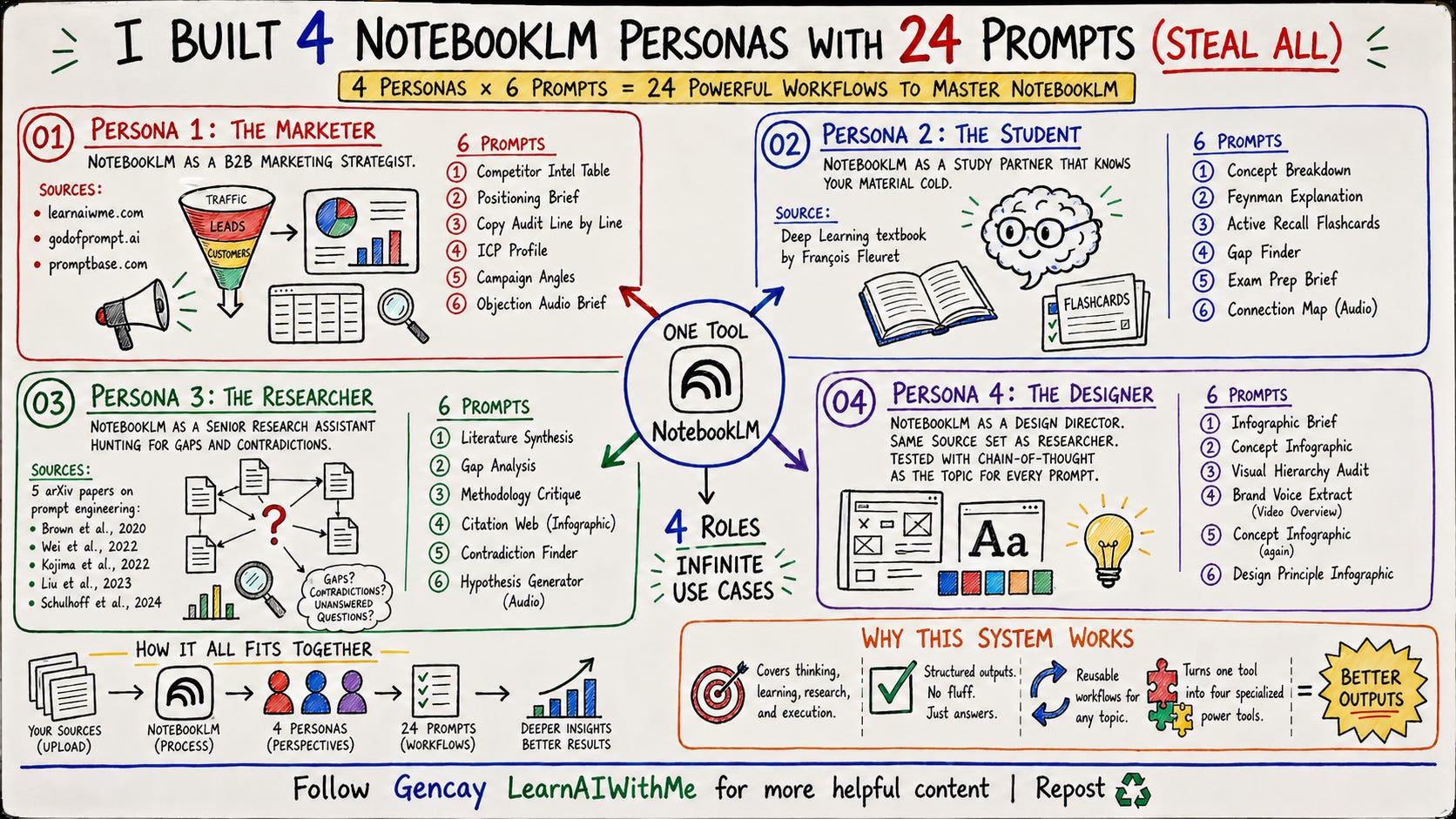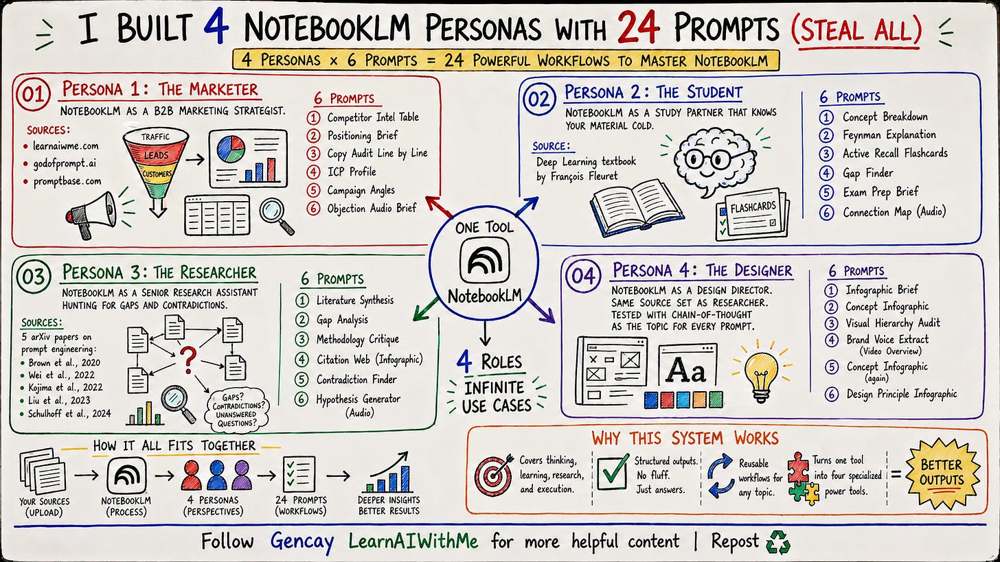The trick nobody talks about. NotebookLM is not a summarizer. It is a persona engine. Same notebook, four voices. Marketer. Student. Researcher. Designer.