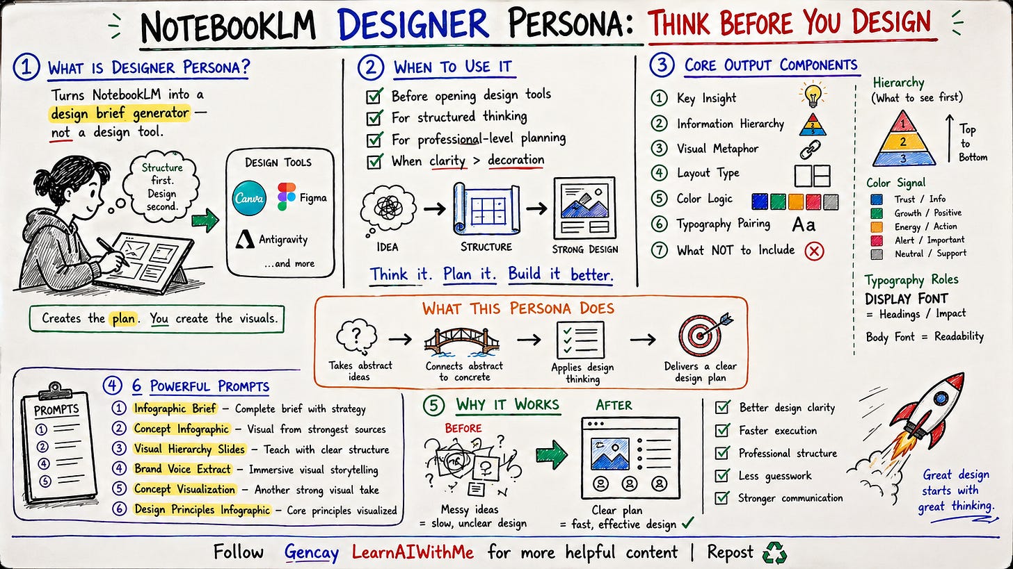 The Designer persona turns NotebookLM into a visual content engine. Infographics, slide decks, and video overviews are generated directly inside NotebookLM, no design tool required.