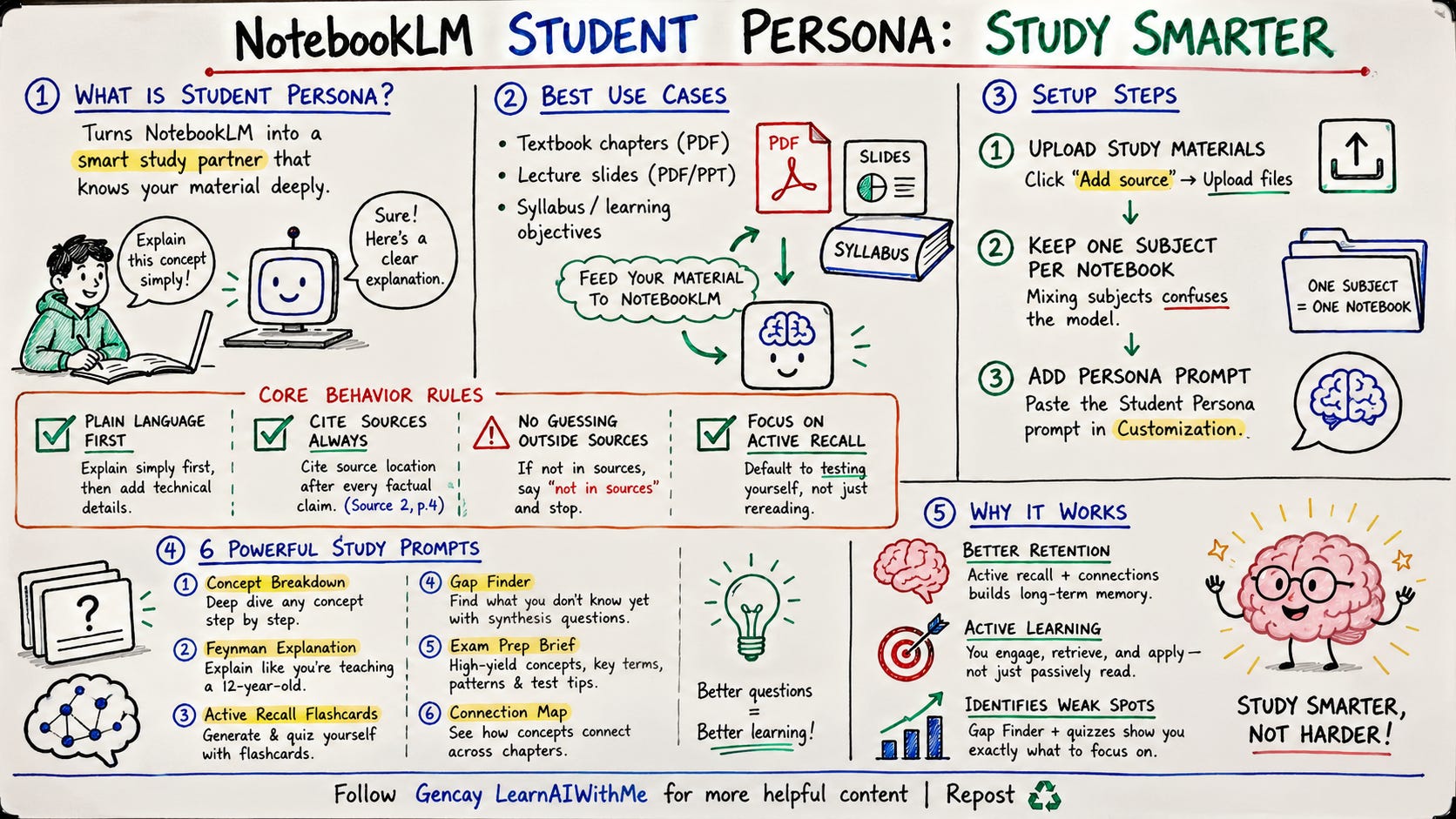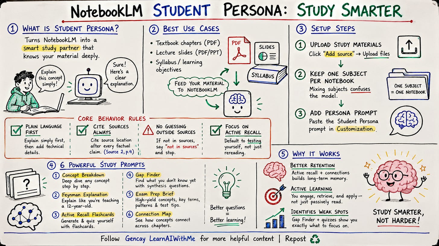 The Student persona turns NotebookLM into a study partner that knows your material cold.