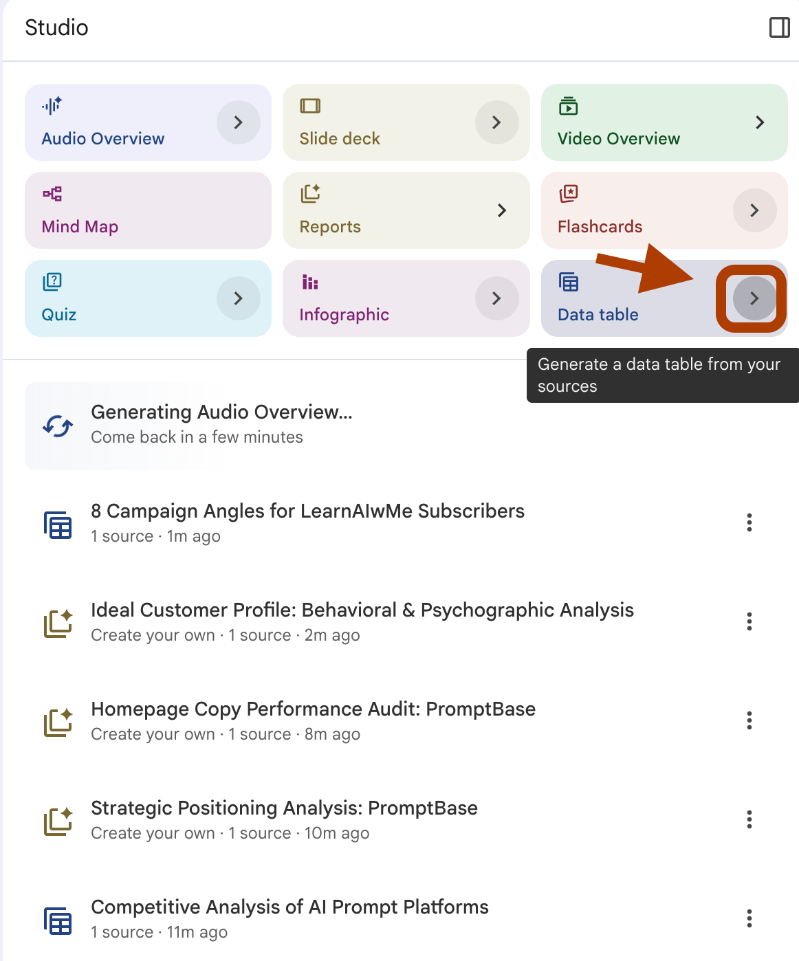 Every persona follows the same three-part structure. Sources you upload (URLs, PDFs, or NotebookLM Deep Research). A setup prompt that defines the role and rules. Six working prompts are tied to a specific Studio button (Data Table, Reports, Audio Overview, Slide Deck, Video Overview, Infographic, Flash Cards, Quiz). The Studio button matters. The wrong button breaks the output.