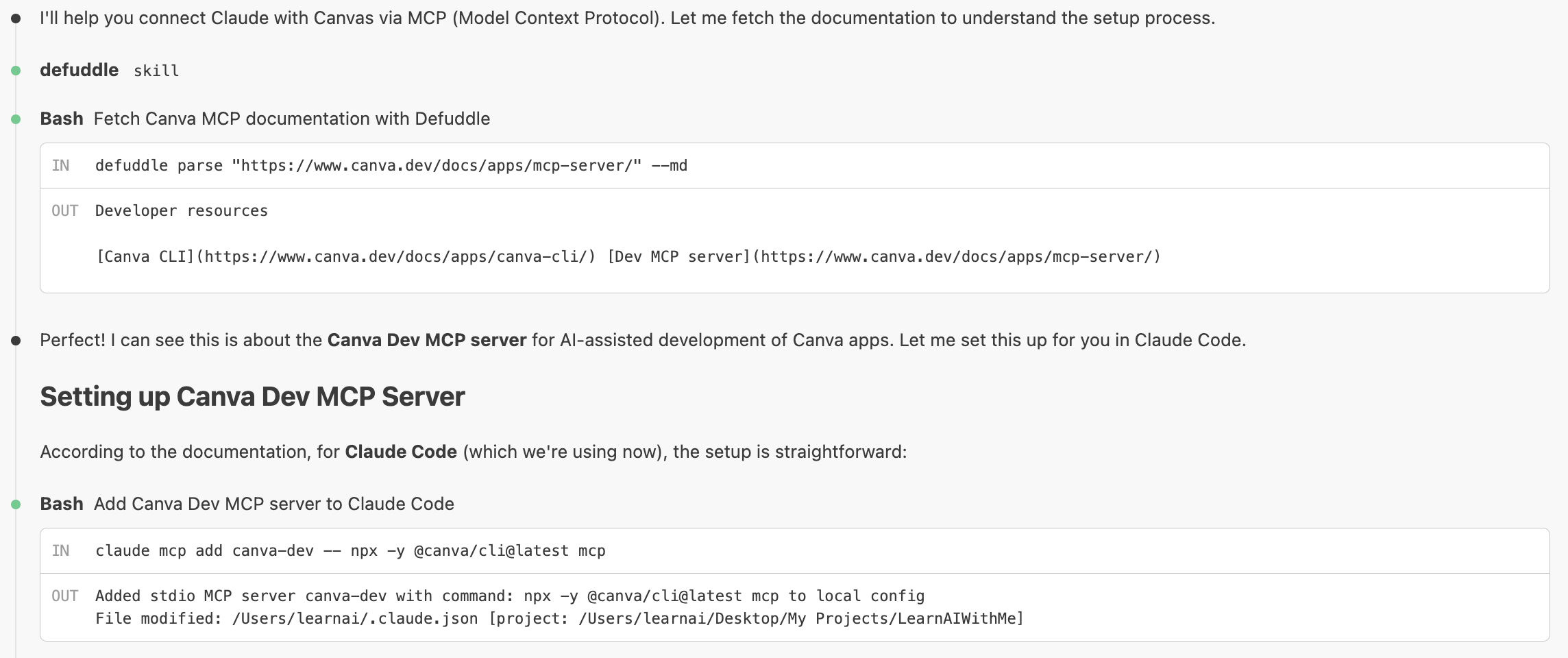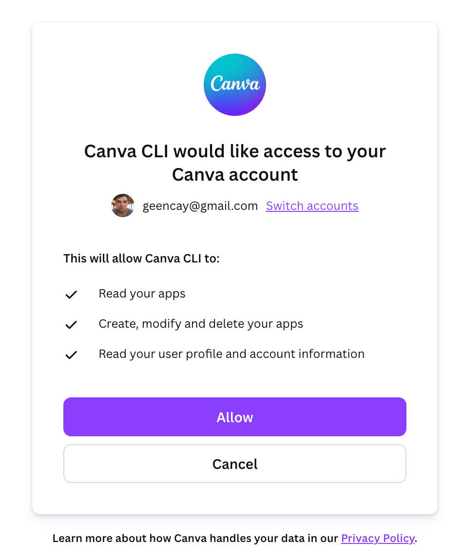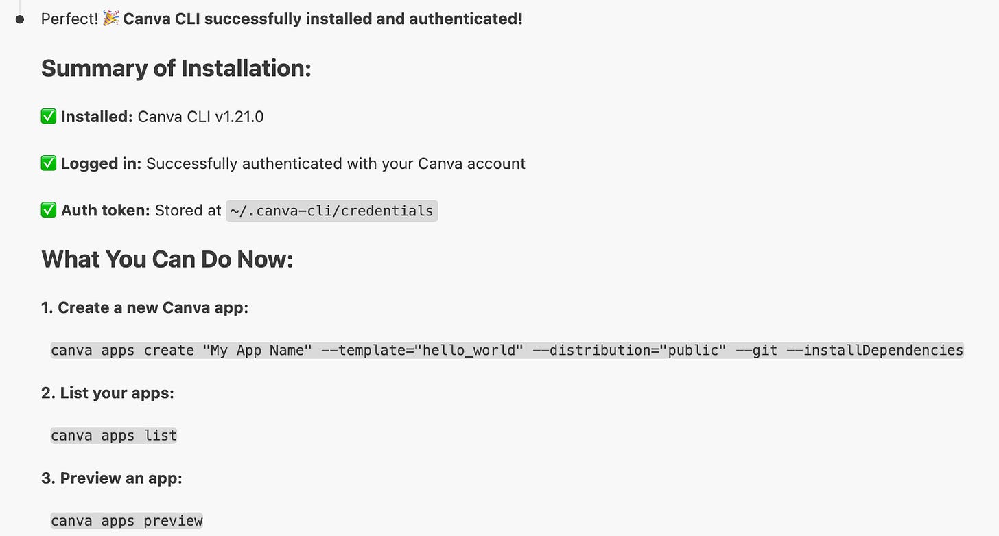 Here is the setup guide : https://www.canva.dev/docs/apps/canva-cli/And wait for Claude’s answer.