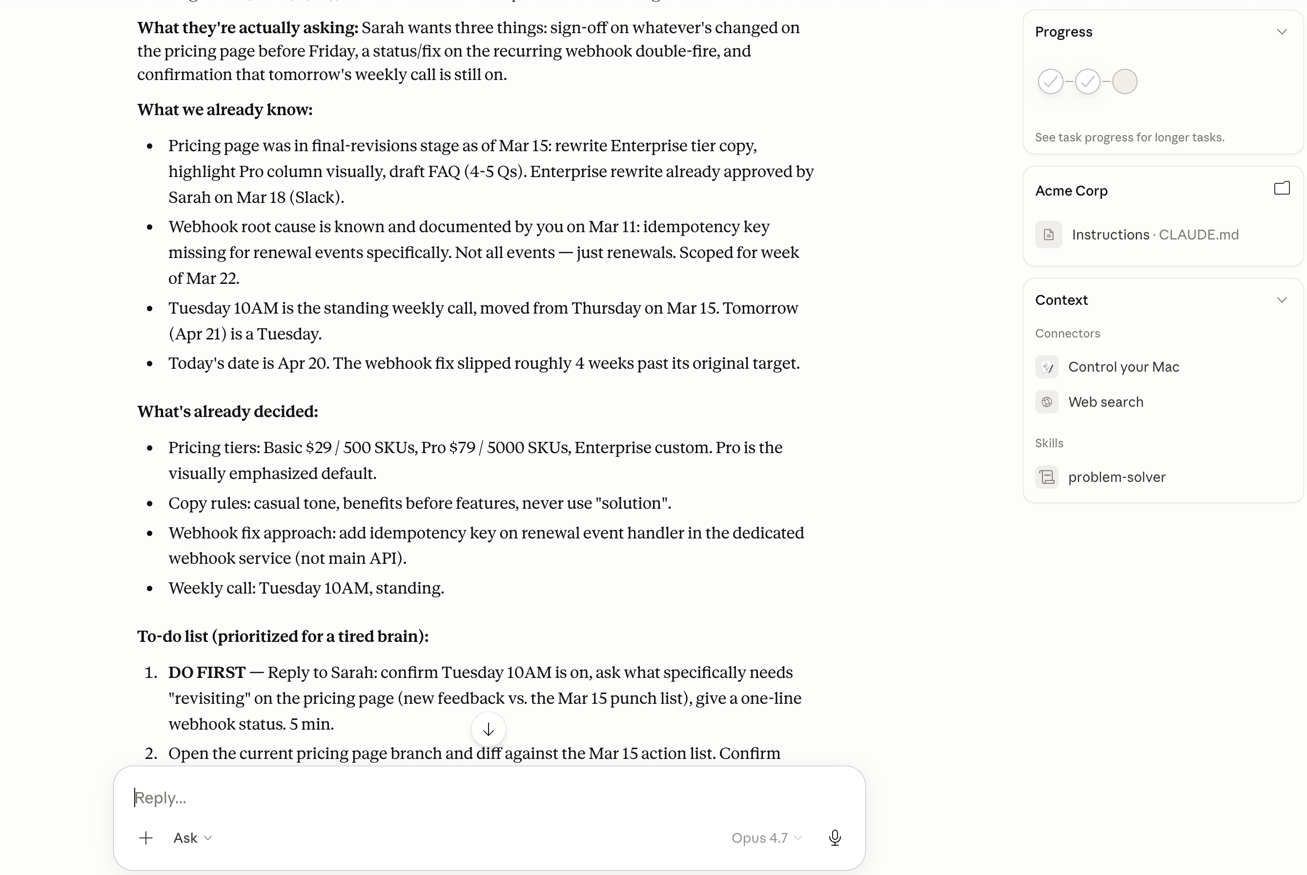 Claude goes to Acme Corp/ in the vault. Reads the last three meeting notes, the current month’s Slack log, and the project brief. Comes back in 20 seconds.