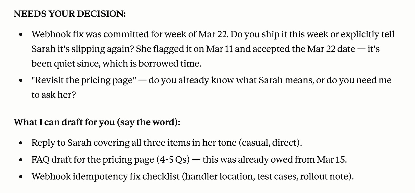 “Hey, we need to revisit the pricing page before Friday. Also the Stripe webhook is still firing twice on renewal. And are we still on for the Tuesday call or did that move? Let me know.”