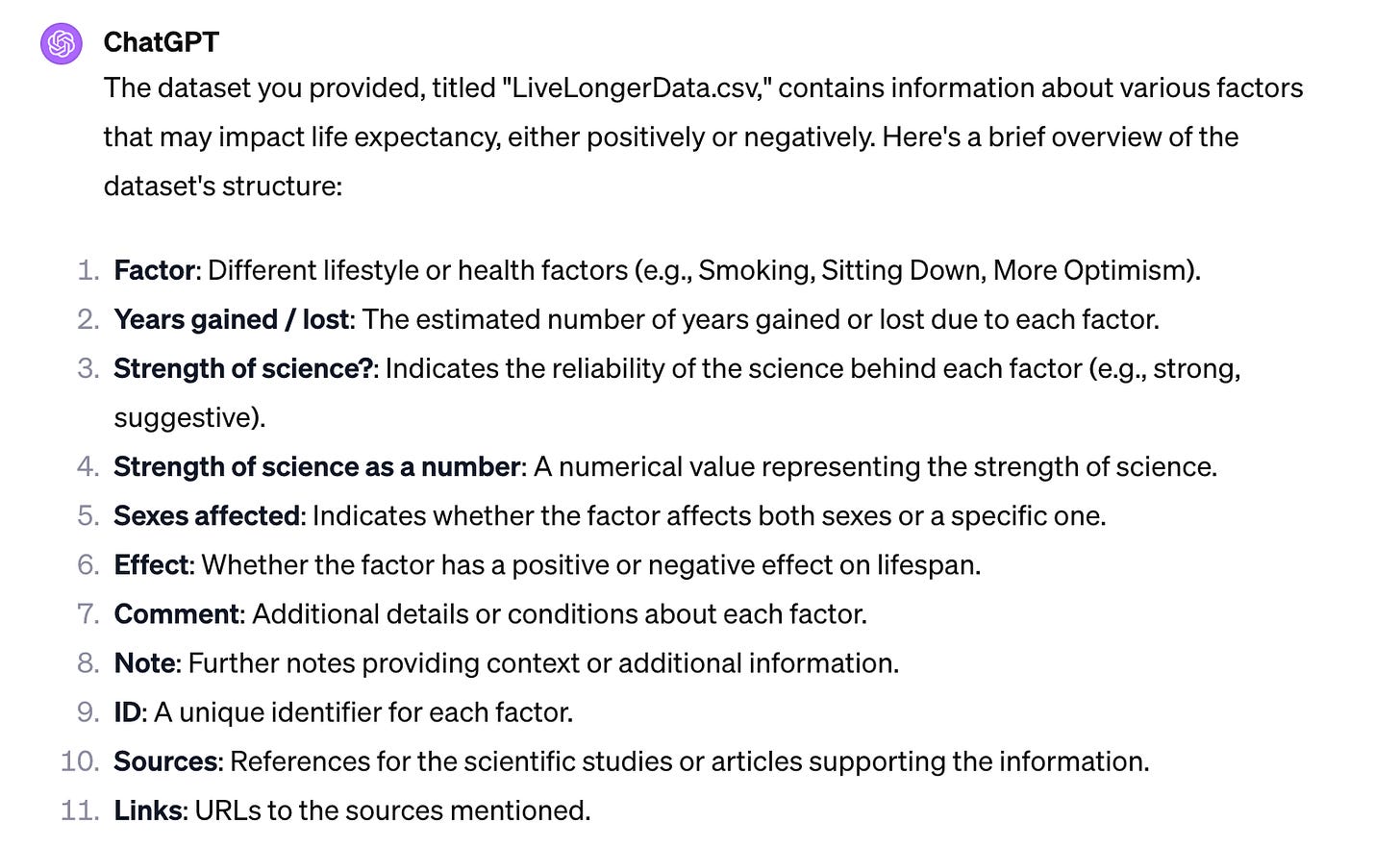 In this data report, I analyzed Life Longevity Factors. In this dataset, I collected from Kaggle. Here is the information about the Dataset, where I collect by using ChatGPT.