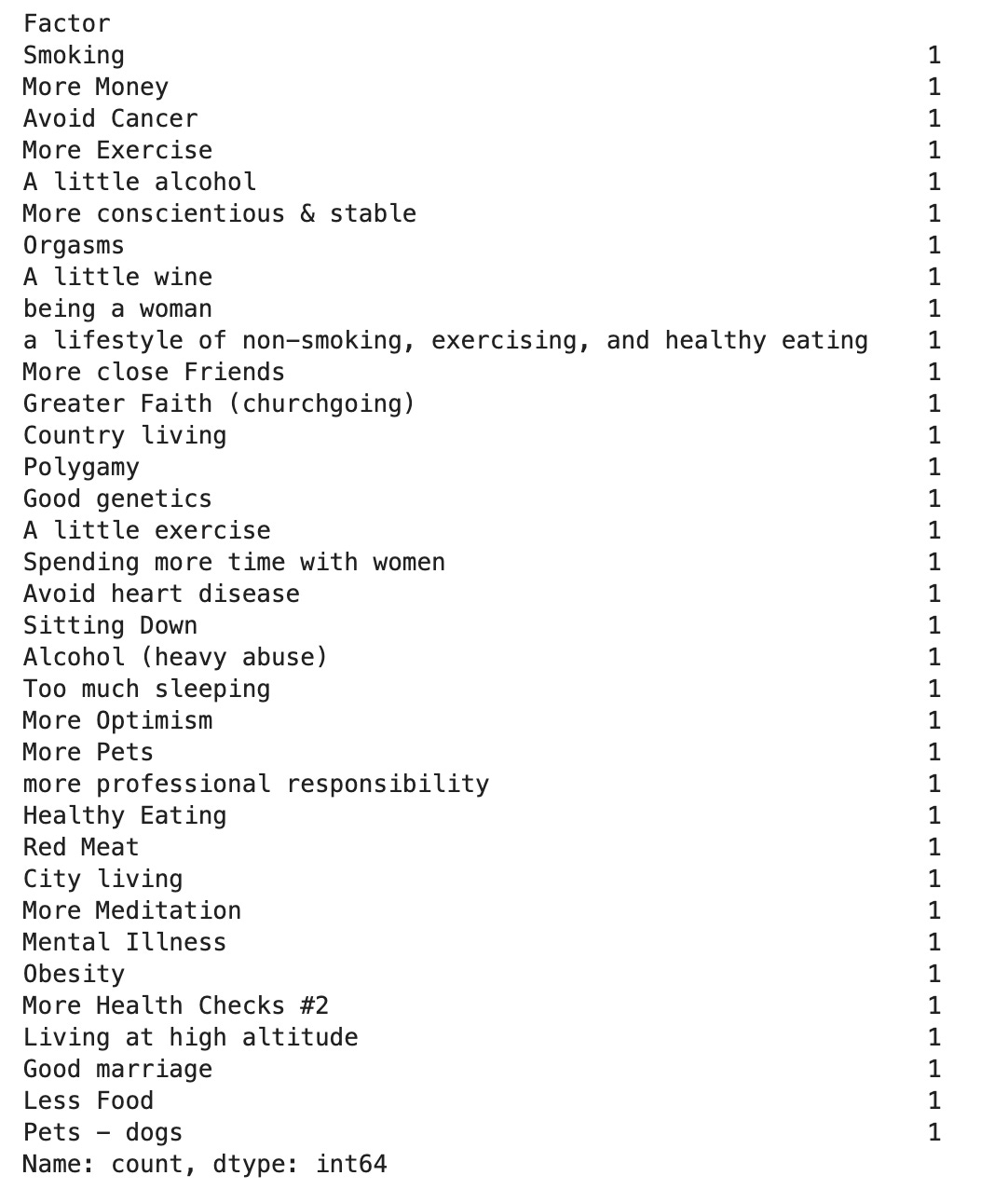 df["Factors"].value_counts()As you can see, this research has been done to analyze different factors and how they affect your life. If you want to read a further analysis, read this one.