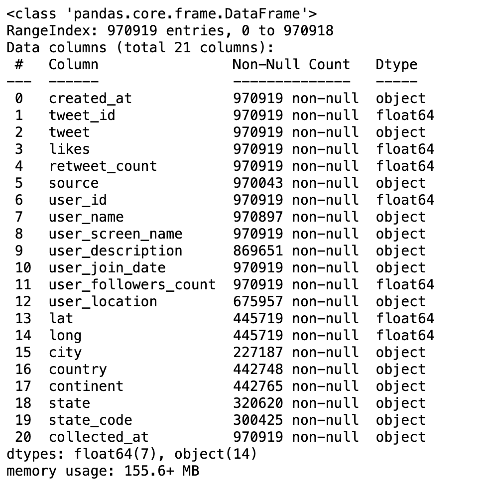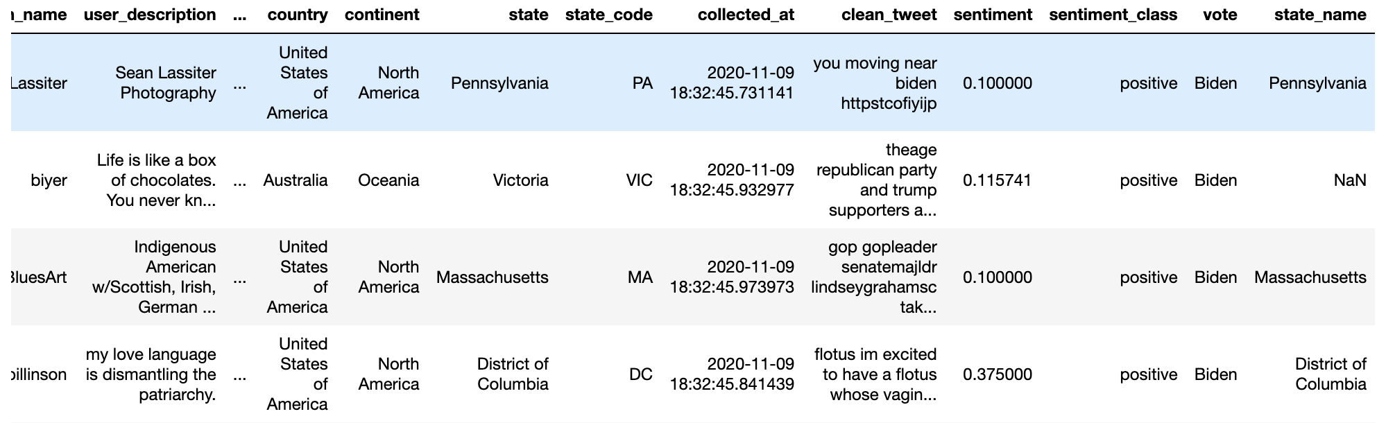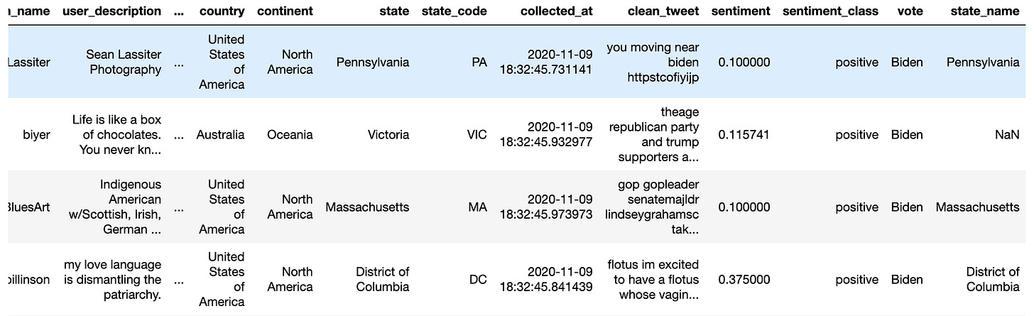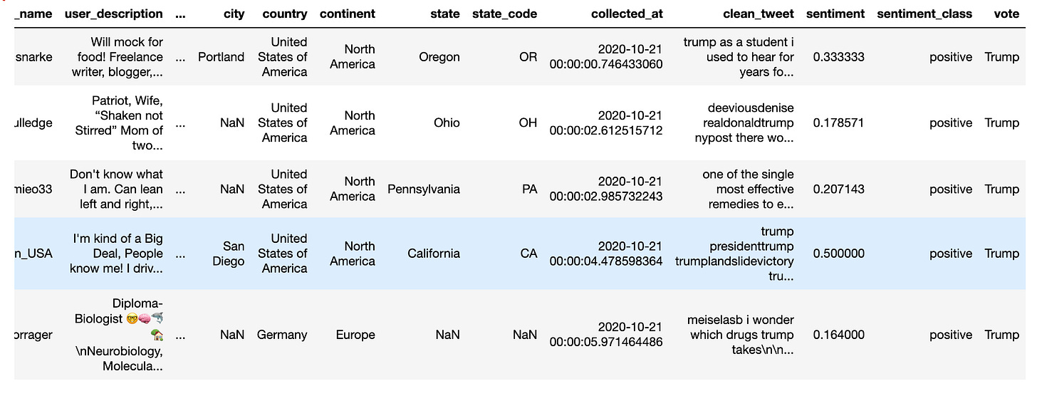 We notice how the datasets for Trump and Biden are structured, focusing on key columns like tweet content, likes, and retweets, which might hint at public sentiment. We also observe geographical data like user locations, providing a glimpse into the diverse origins of these tweets.