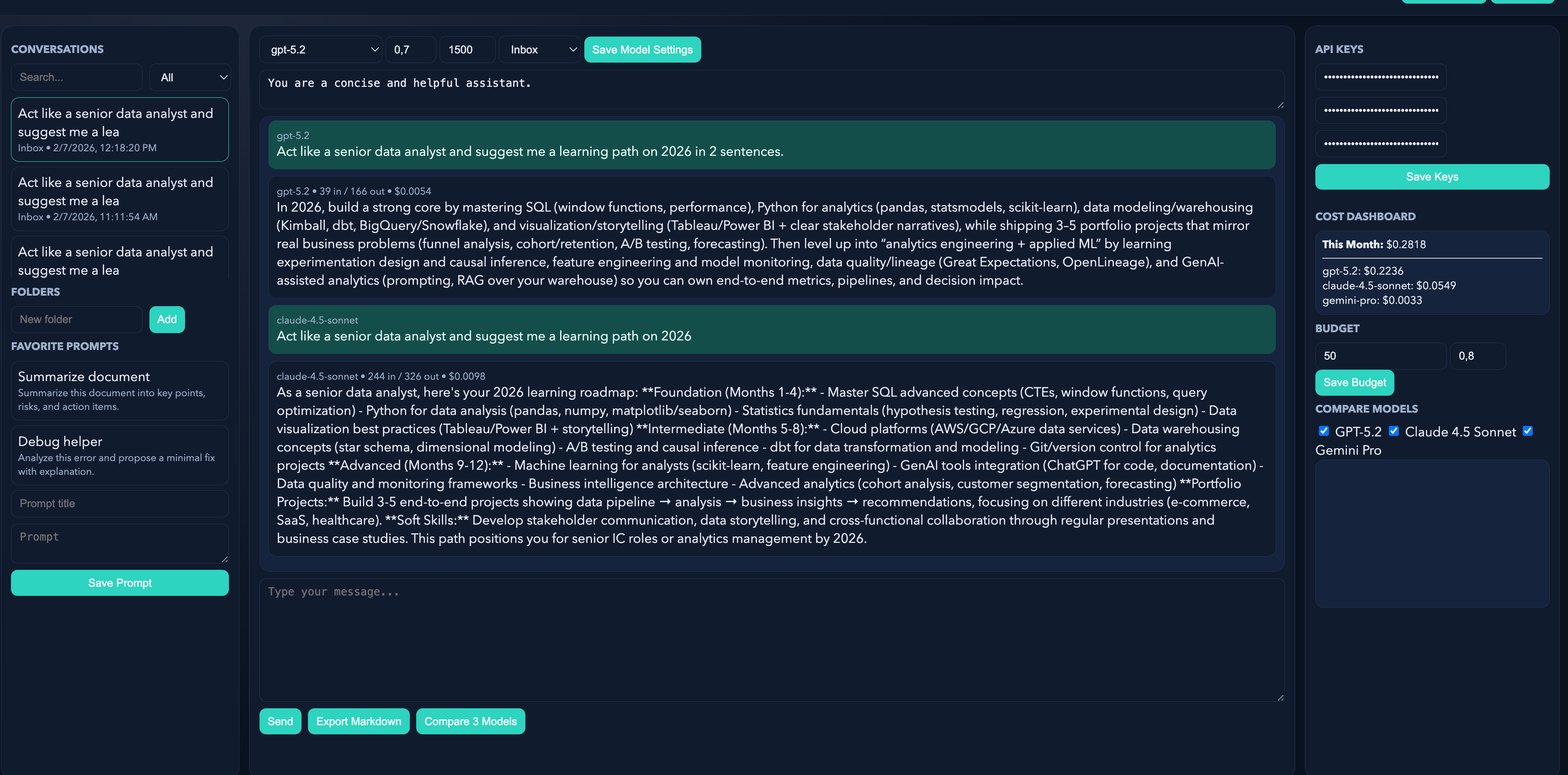 So, you can use all major AI models by adding their API’s, and see the cost at the same time.(ChatGPT, Claude, Gemini.)