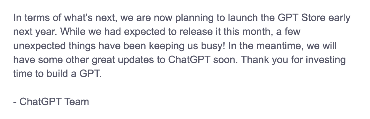 However, OpenAI sent emails to GPT builders, notifying them of the delay, as follows.