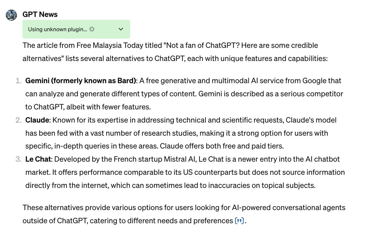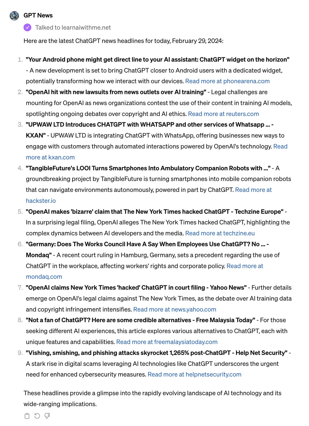 While AI news might be enough for you, if you want to know more about ChatGPT specifically and want to track its news, this one is. Let’s click on the conversation starter, like the one below, and see the output;