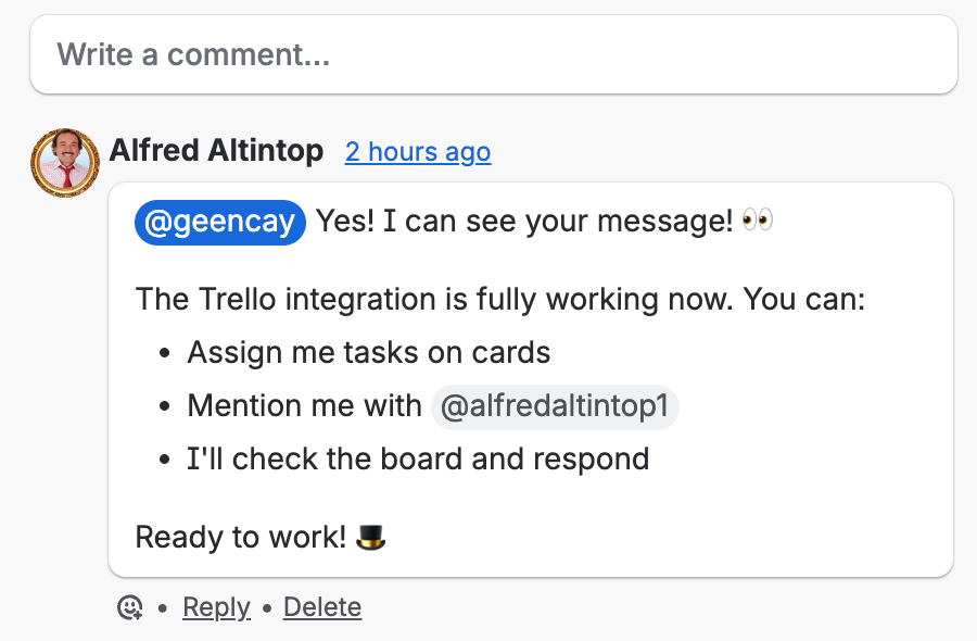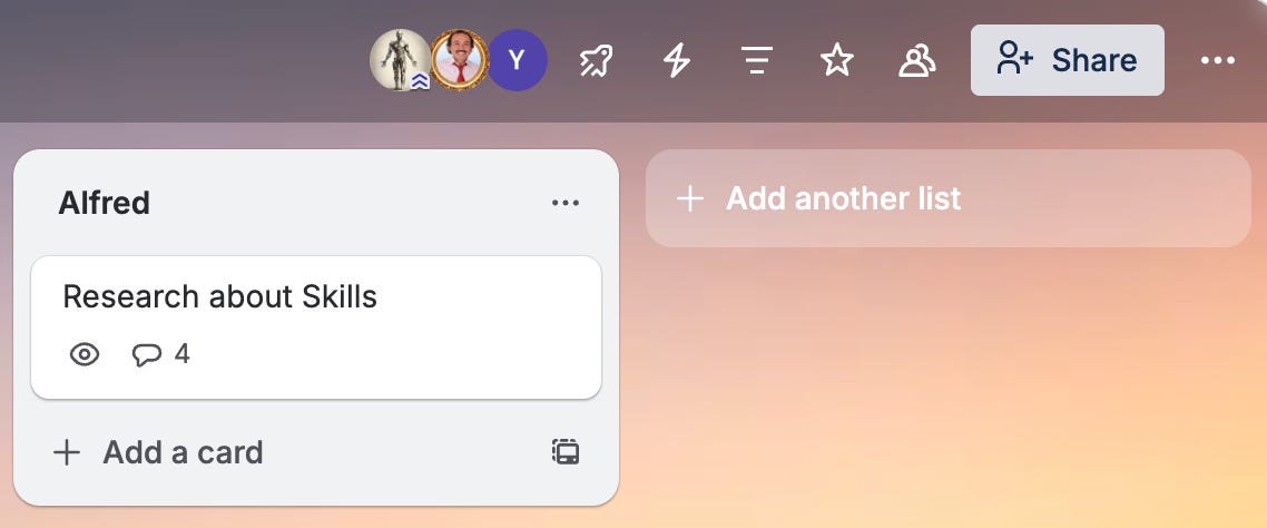 You assign a card: “@Alfred, research 5 trending AI topics this week”