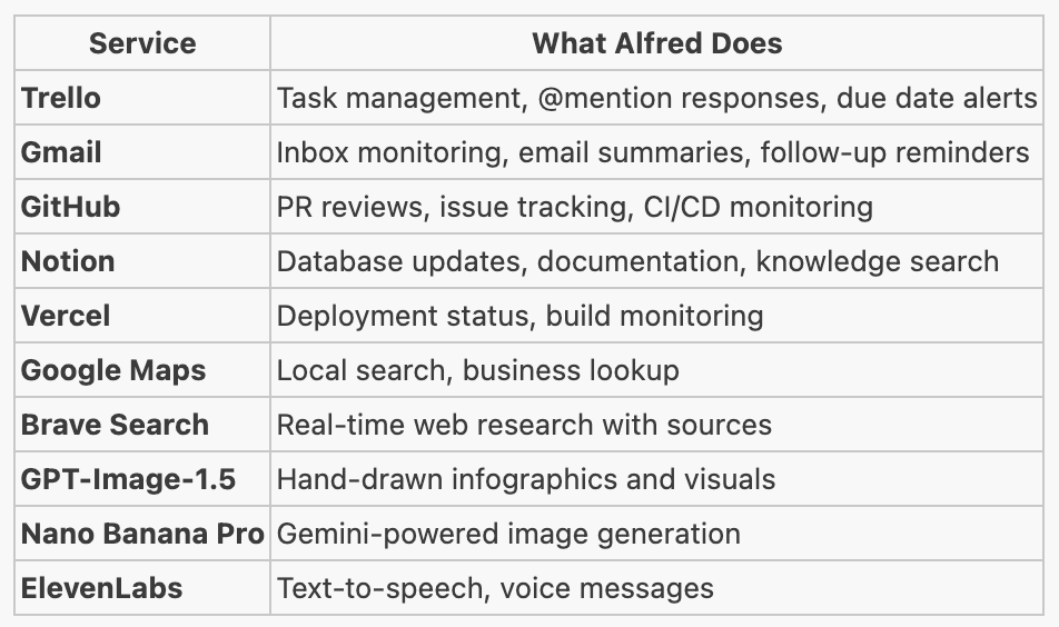 Why it works: You manage Alfred the same way you manage human teammates. Assign task → Get result → Move on.