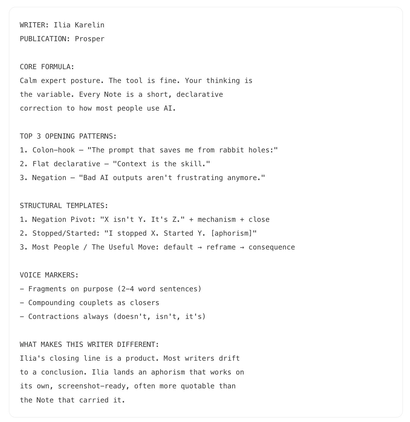 But these are the fingerprints. If you take Ilia’s negation pivot and use it without the compounding couplet close, you get the structure without the signature. The big moves are learnable. The small details are what make a copy feel like a copy instead of the real thing.