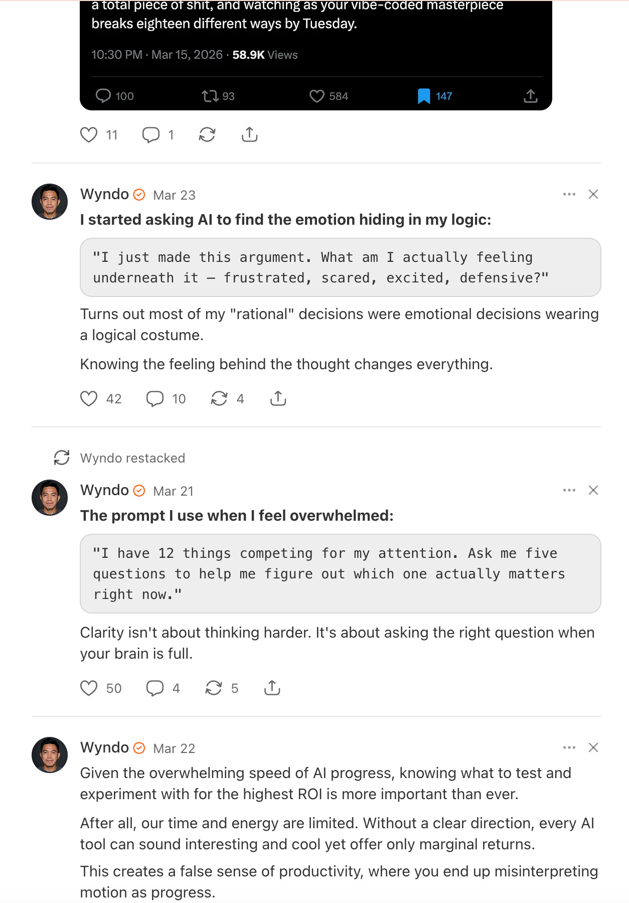 What I noticed: Wyndo treats prompts like products. He publishes them verbatim, in quotes, as if they’re the artifact.