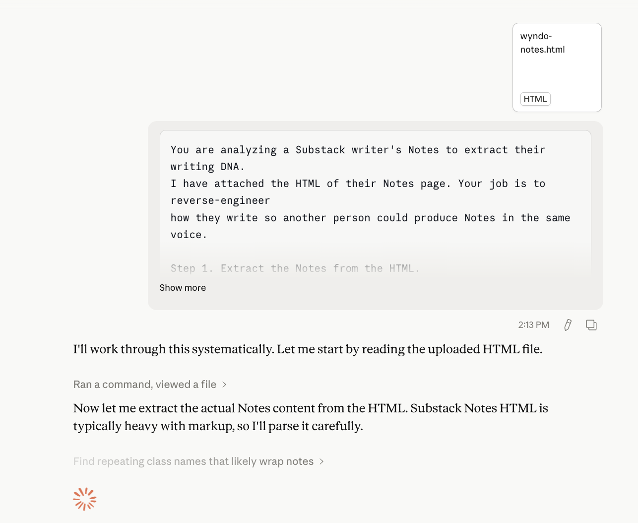 Open a new chat in Claude, attach this HTML, wyndo-substack, and paste this prompt.