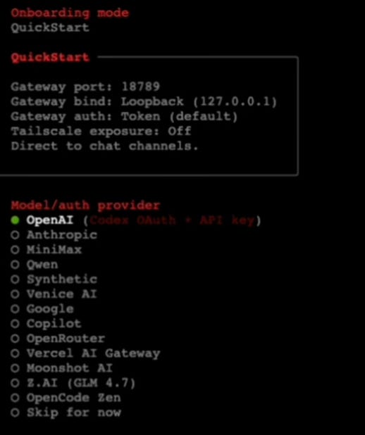 curl -fsSL https://molt.bot/install.sh | bashAnd you’ll be directed to the Onboarding.