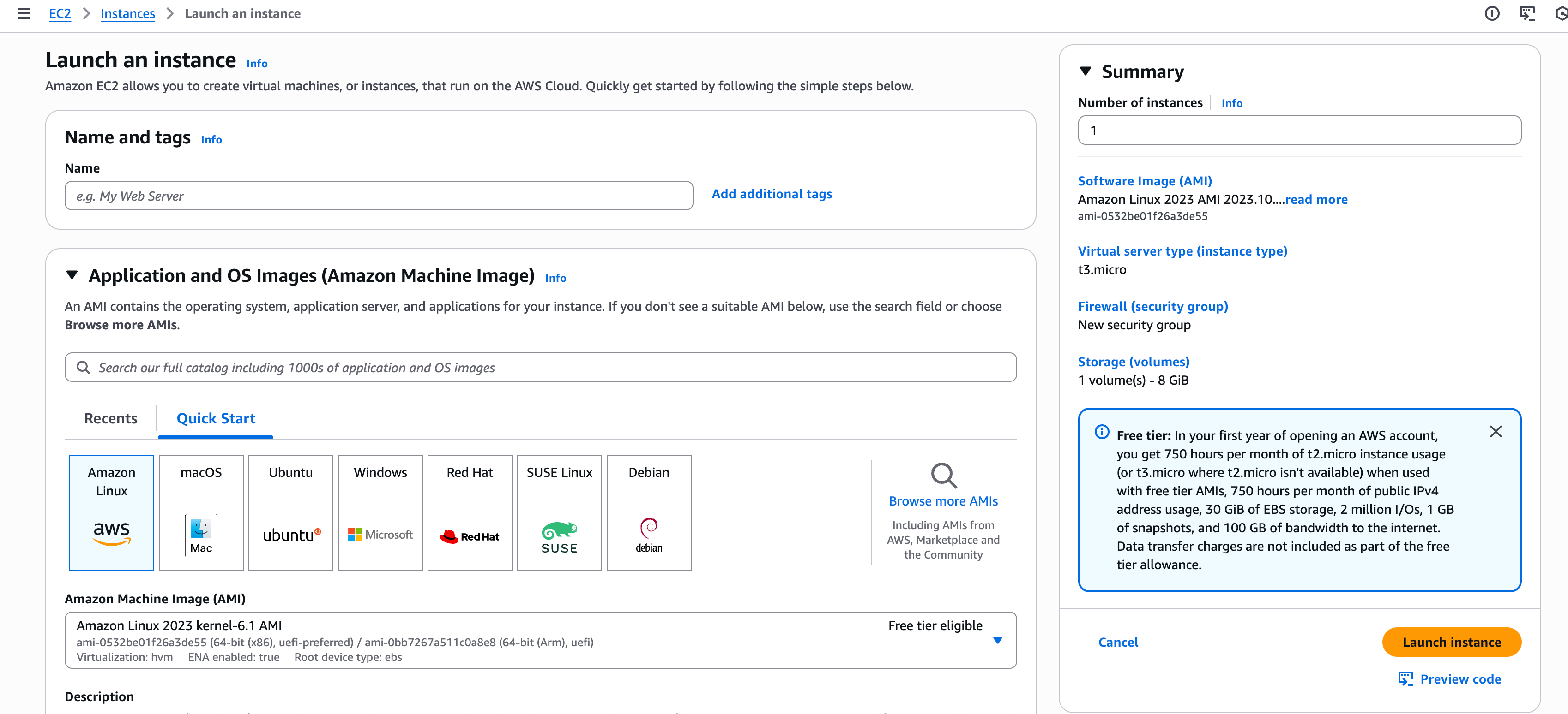 When you click on “Launch an instance”, the following screen will pop up.