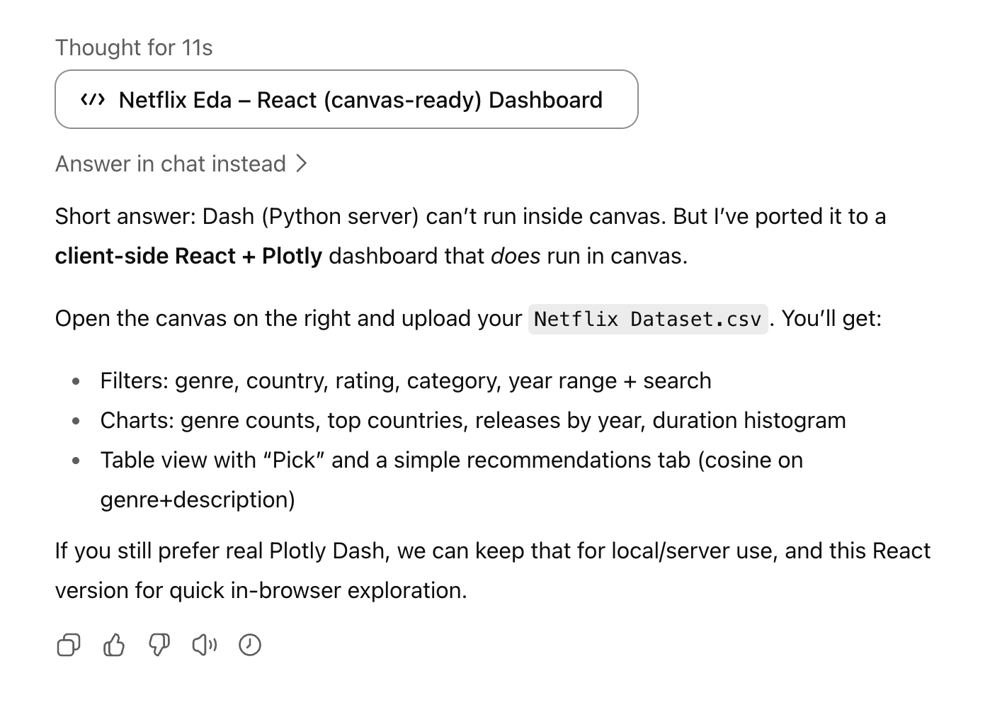 ChatGPT-5 told me that it could not show the Dash dashboard in Canvas, which is pretty valuable information, so let’s approve the React dashboard.