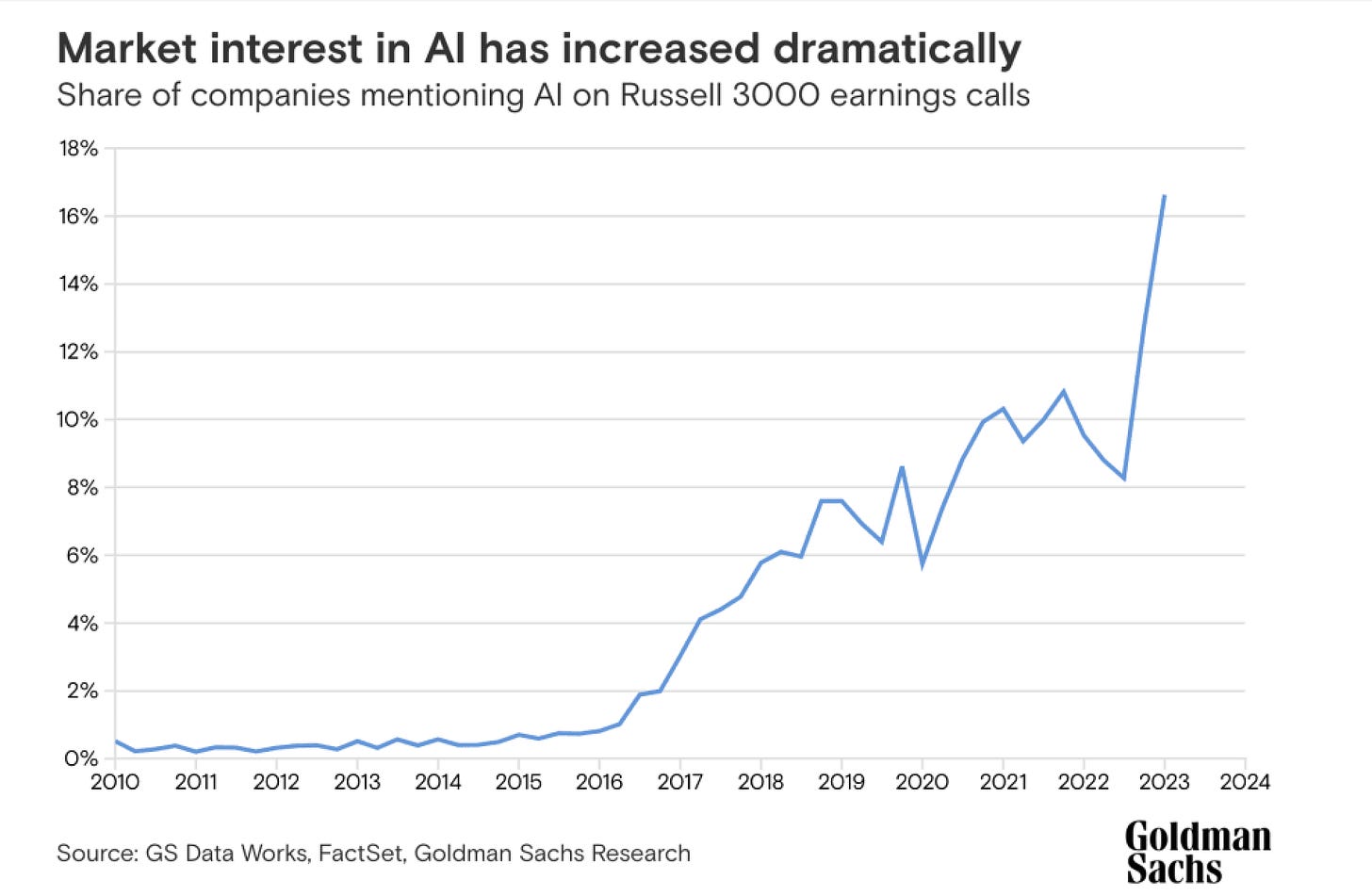 According to the research, being done by Goldman Sachs, Market interest in AI has increased dramatically. The share was %0.81 in 2016, but in 2023 it is %16.63, which is over a 20x increase in 7 years.