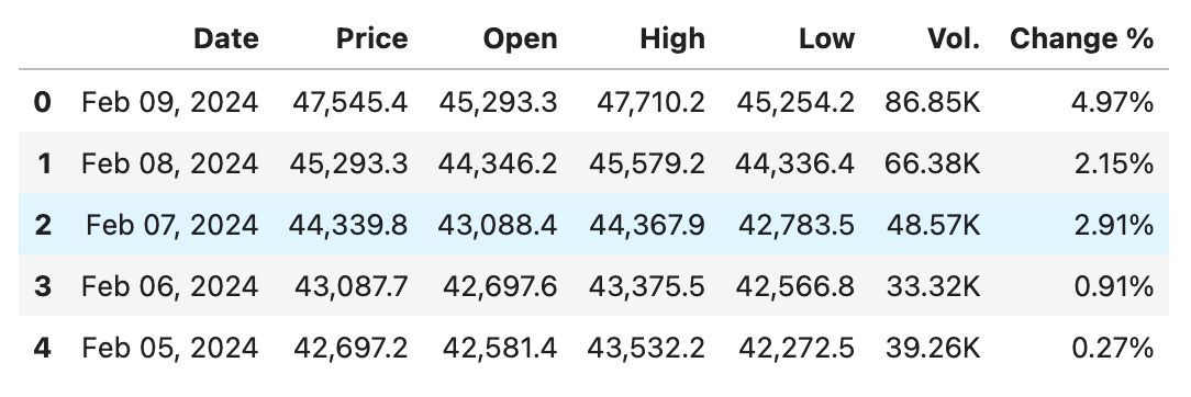 Date Range: The data includes dates from at least February 5, 2024, to February 9, 2024, suggesting a recent snapshot.