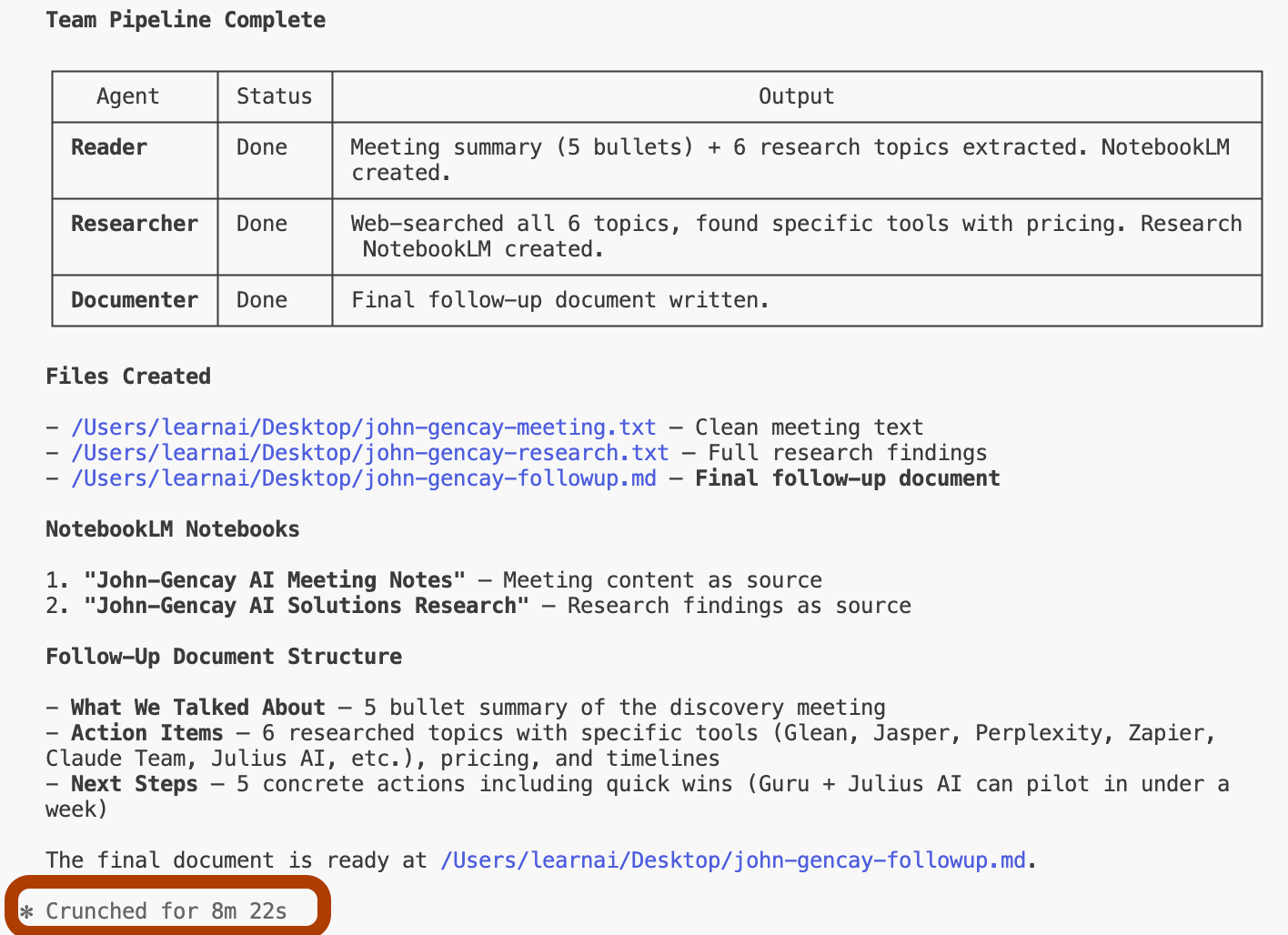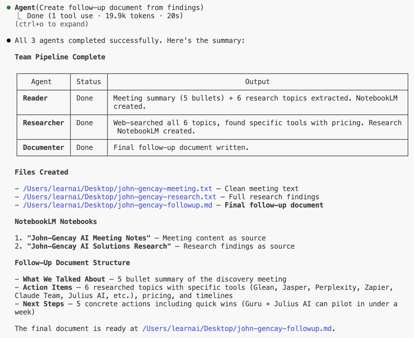 Agent 3: Generates the final follow-up document using both NotebookLMs