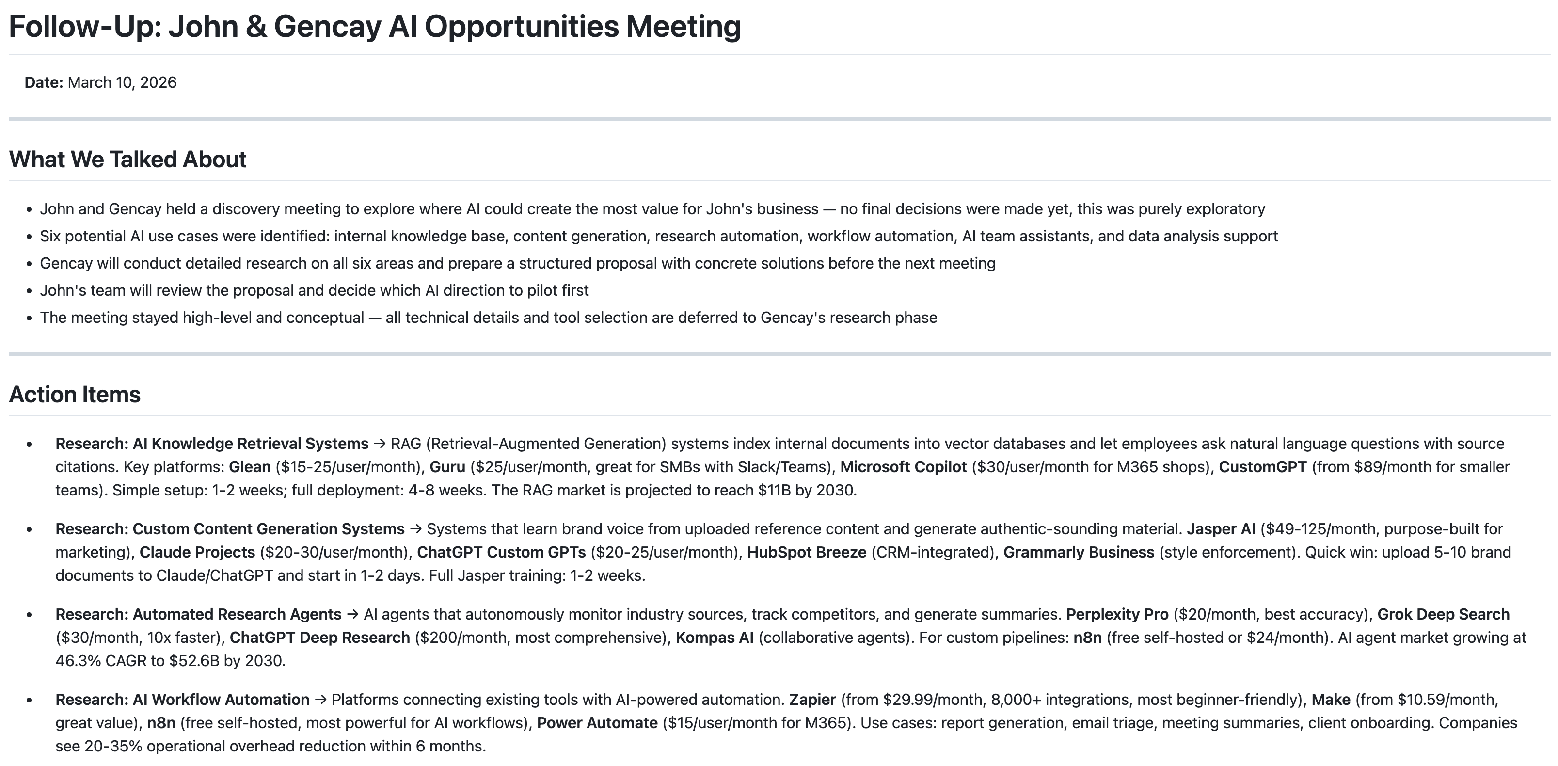 Research findings included. Action items listed. Next steps ready.
