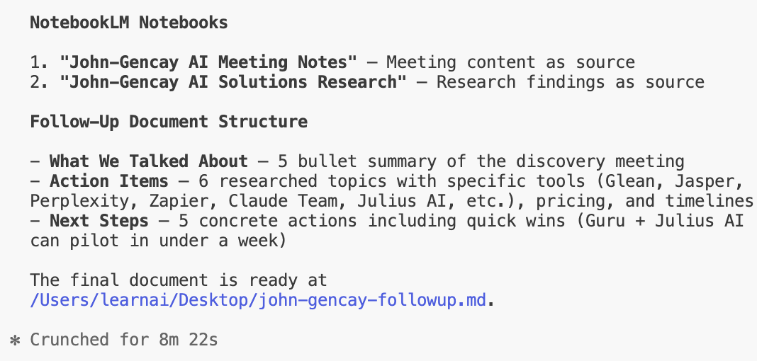 NotebookLM & Claude Code Agents: One Prompt Turns Meeting Notes Into Research-Backed Reports