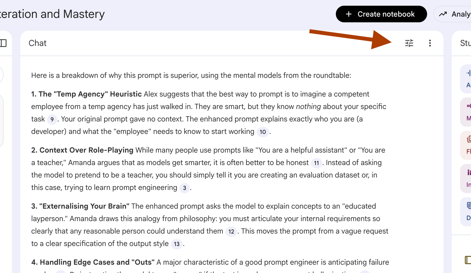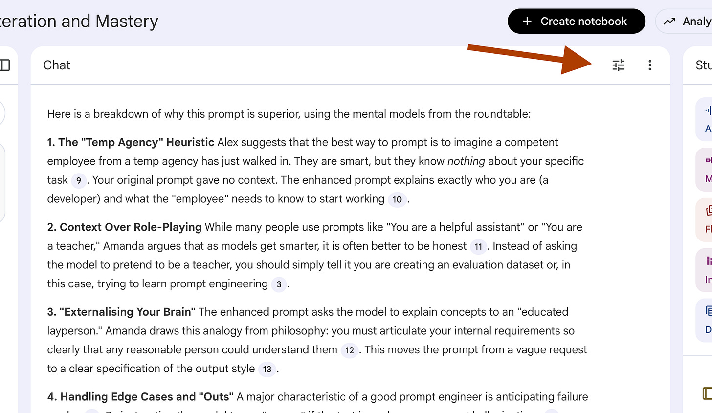 In the middle, you can see the “Chat” part, where you can talk with the NotebookLM.