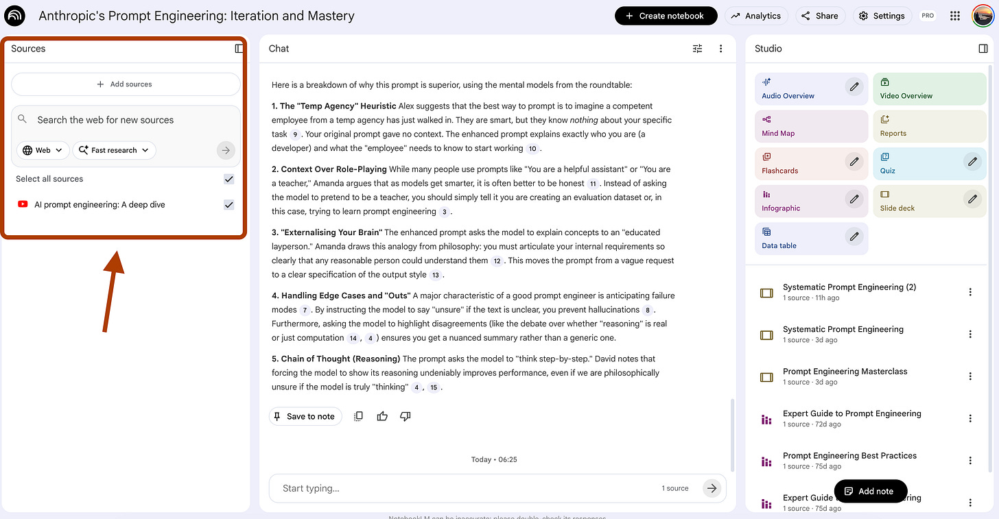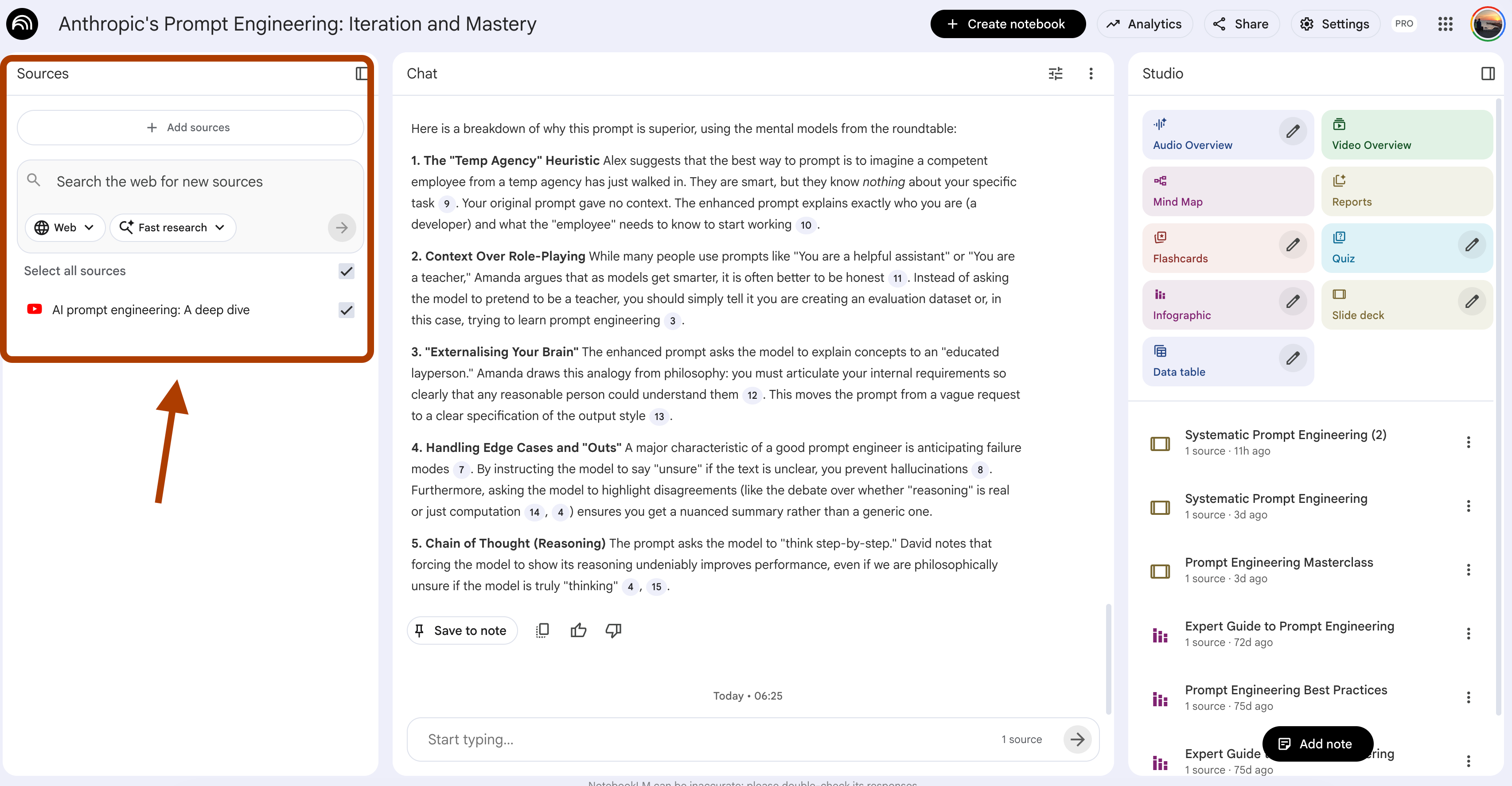 On the left of the screen, you can see the sources. These are NotebookLM’s memory.