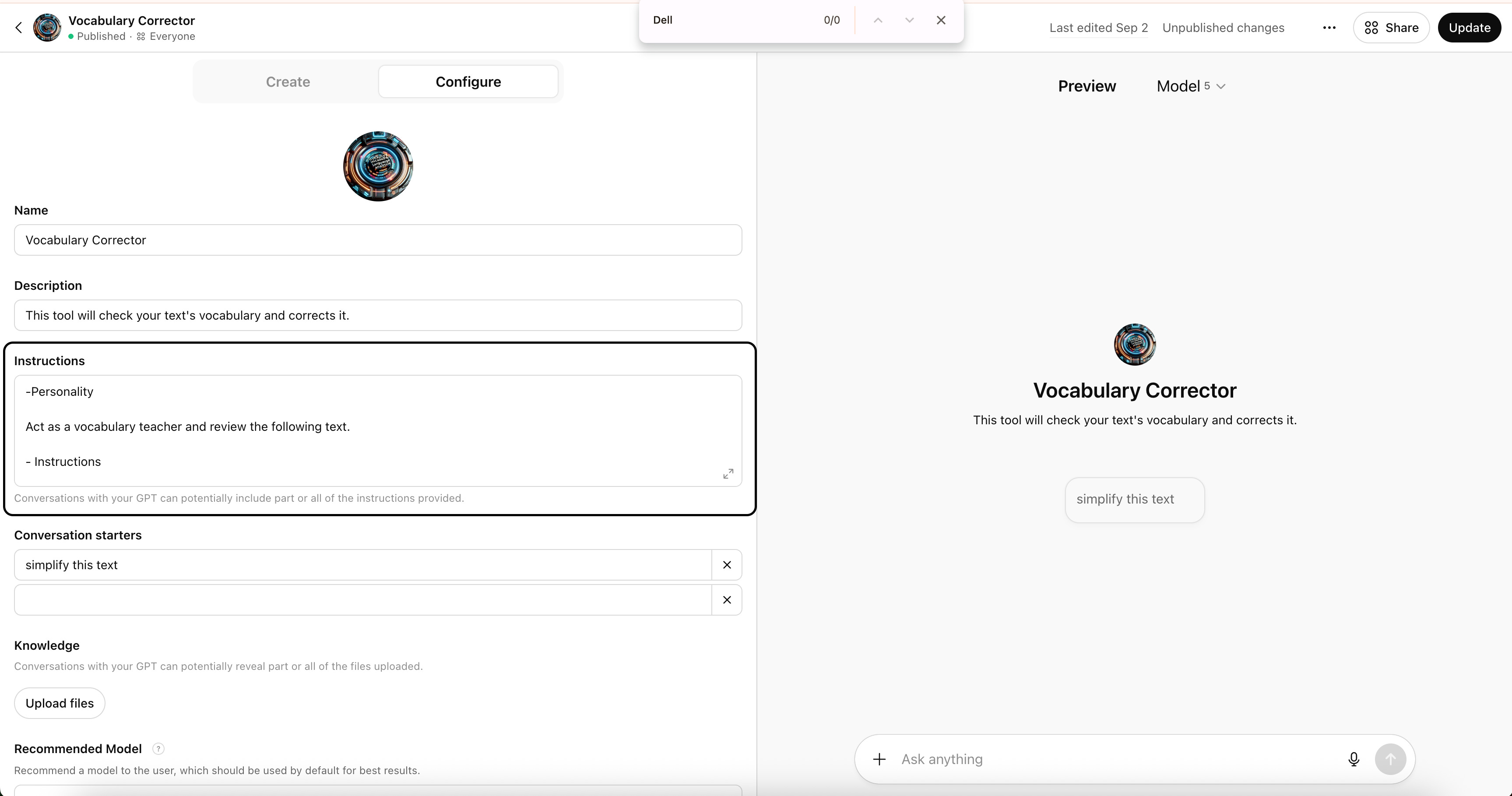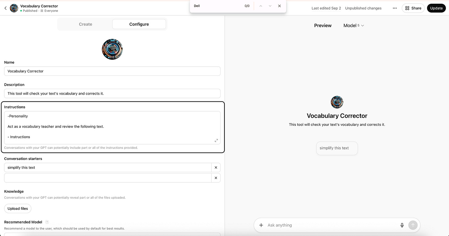 Here, you’ll write the prompt that works behind the scenes. The most important part of creating a Custom GPT is crafting the prompt instructions.