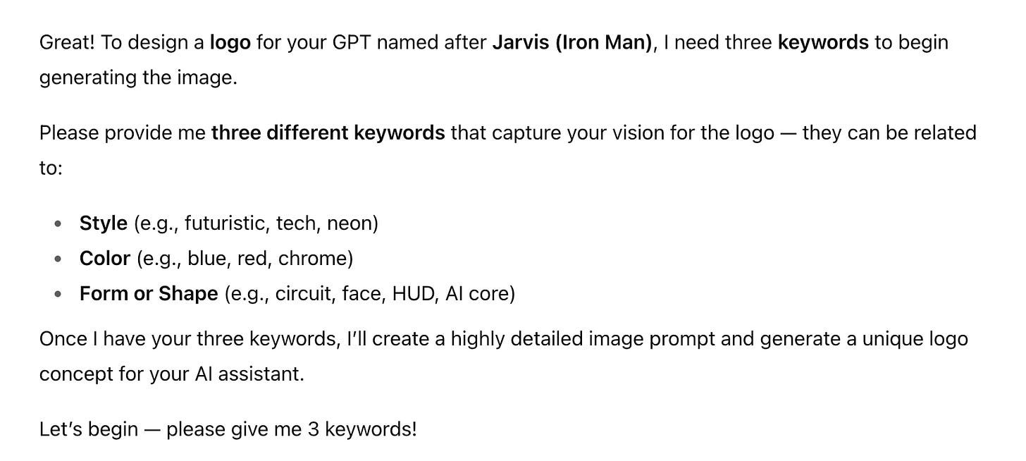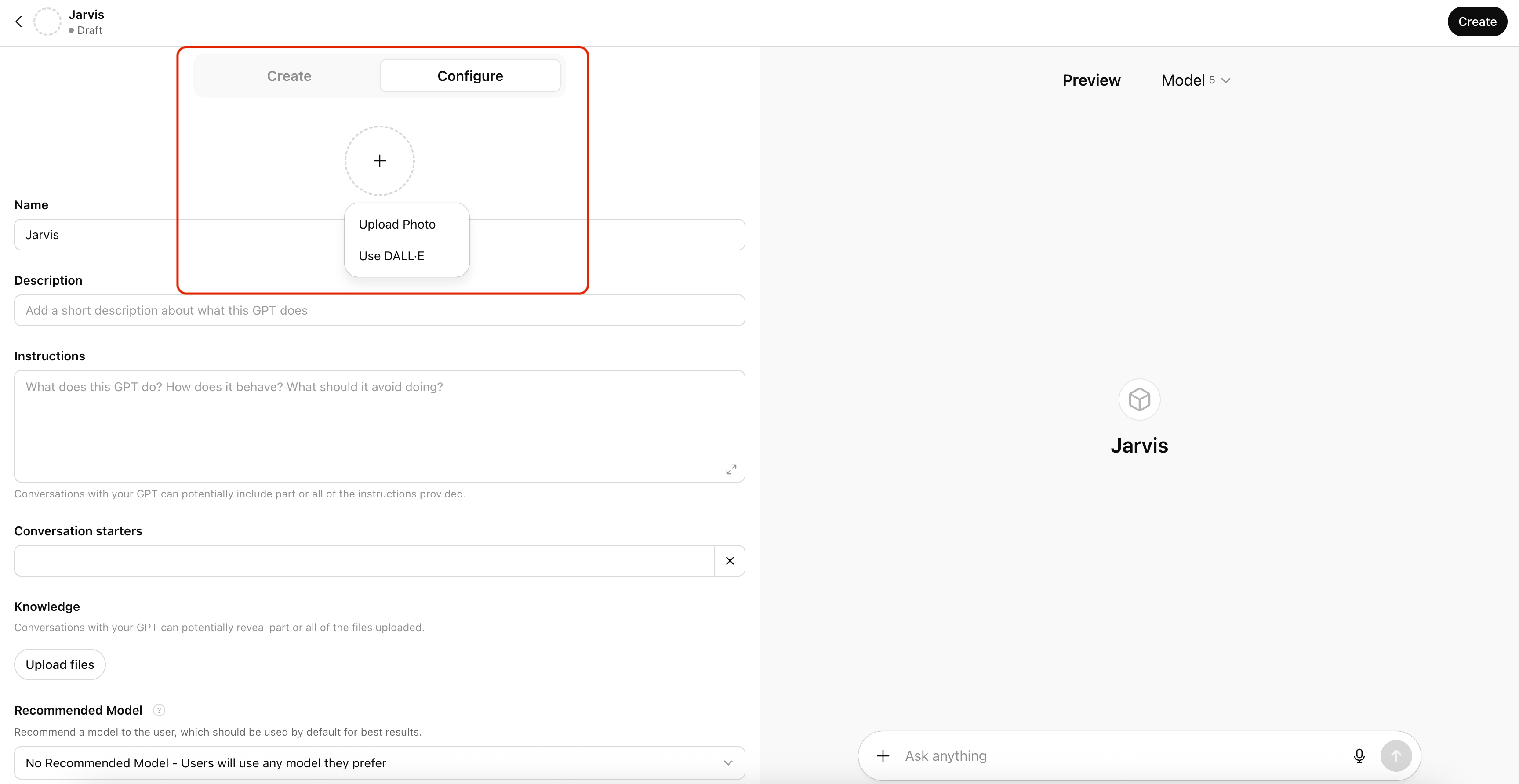 Let’s name it “Jarvis,” like the movie Iron Man. Click on the “+” button and you’ll see two options to add a logo to your customGPT.