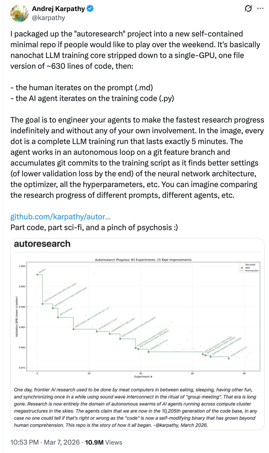 Karpathy’s AutoResearch runs 100 ML experiments overnight on GPUs.