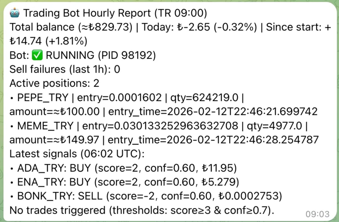 The bot ran 24/7 on AWS. Hourly Telegram reports. Stop losses on everything. Trade journal logging every single entry and exit.