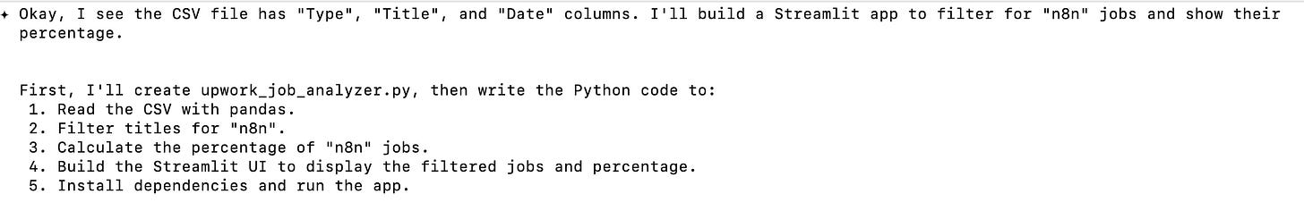 When I click on it, I should see the related job postings and the percentage of jobs about n8n.Here, Gemini CLI creates the task list.