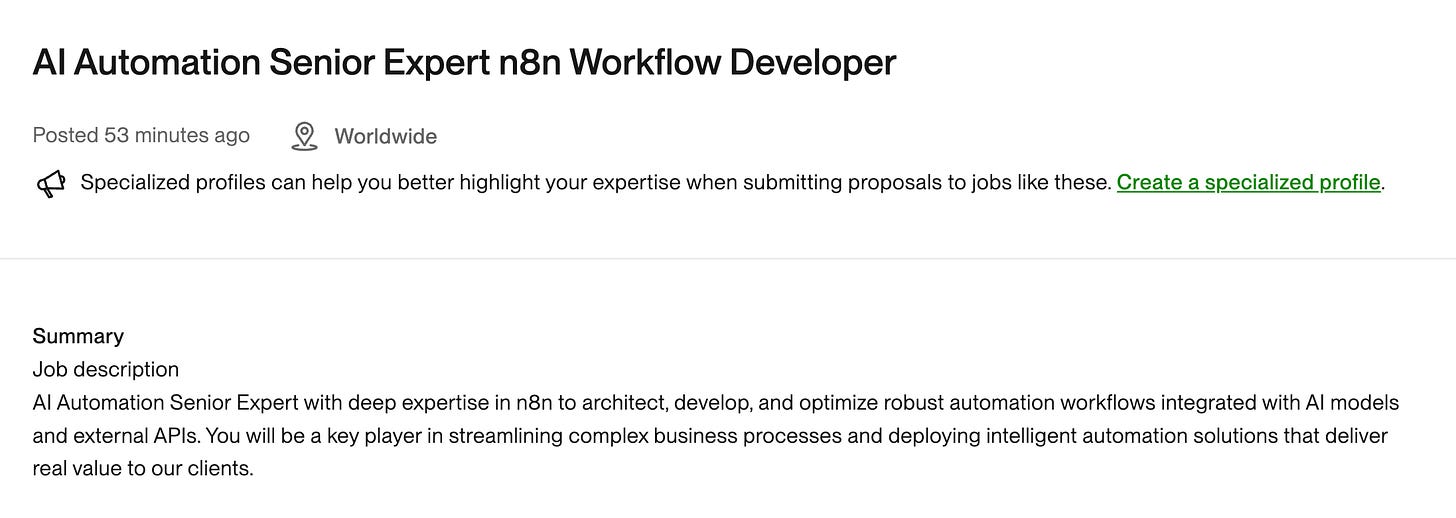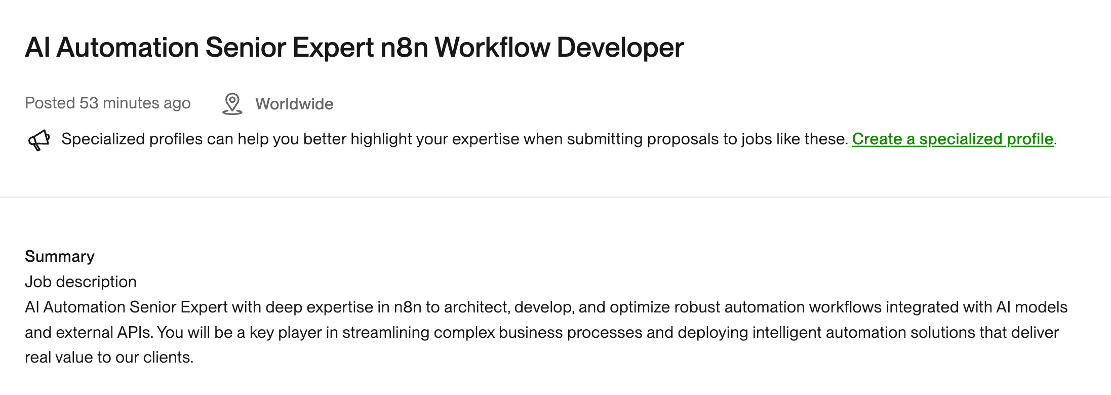 In this article, I’ll show you how to use n8n to build your own AI agent and how this skill helps you get freelance jobs on Upwork.