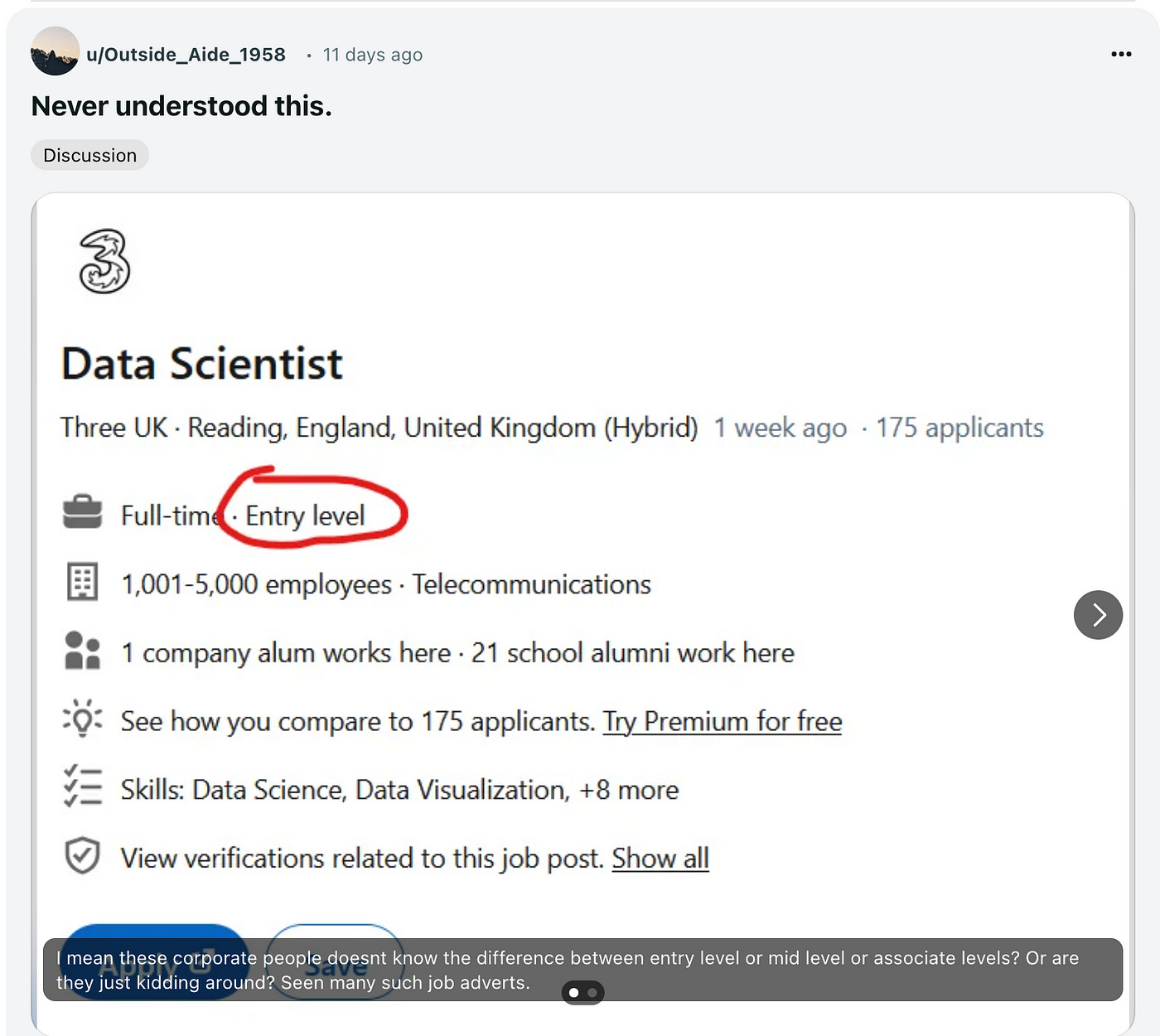 This post is the one that inspires me to write this article. It looks like this company is seeking an entry level data scientist.