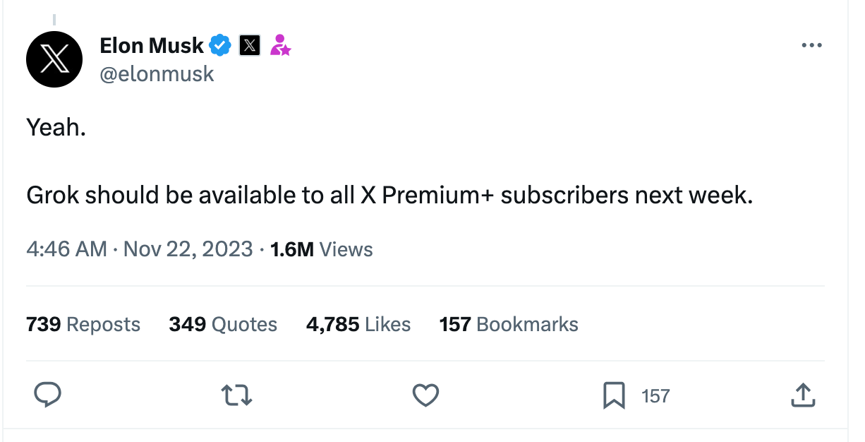 According to the news, which Elon Musk personally declared from his X account, it looks like Grok will be available next week to all X Premium+ subscribers.