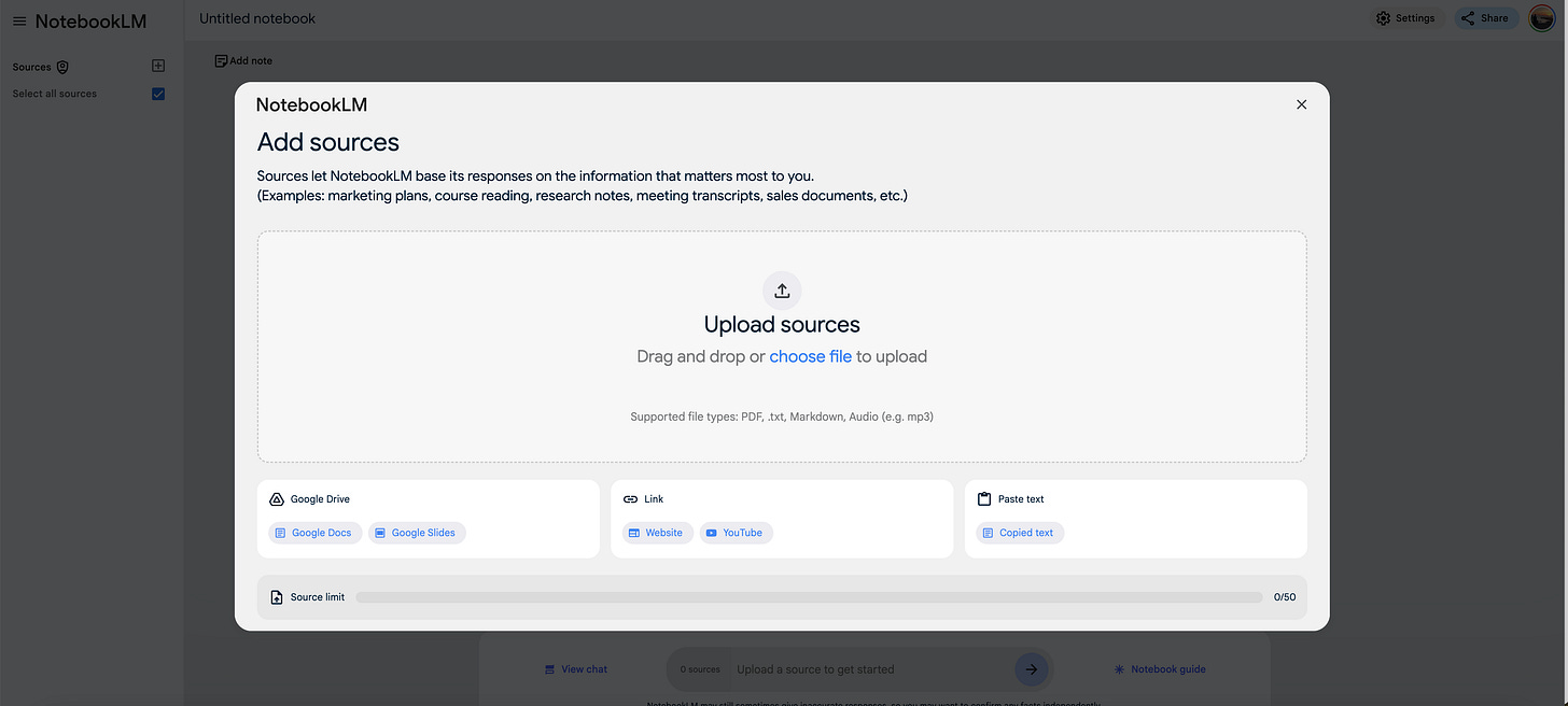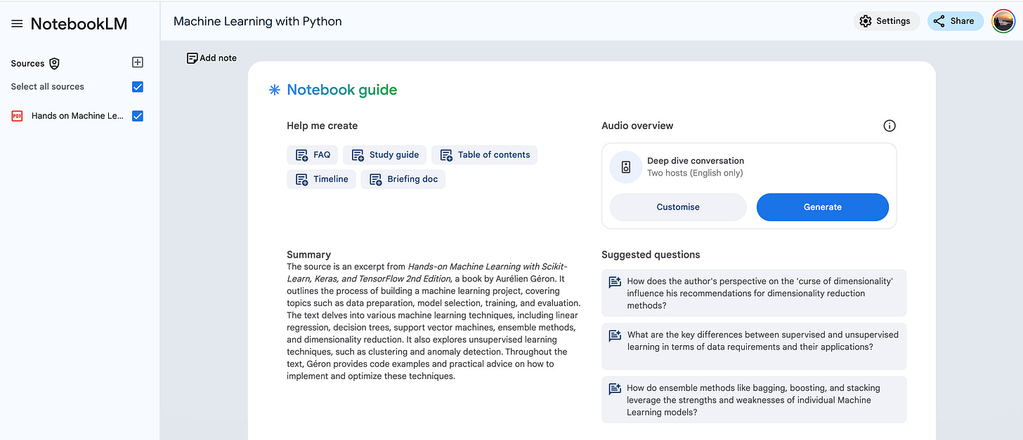 You can upload PDFs or Google Docs, and it will organize, summarize, and even answer questions about your content. Let’s load a technical book.