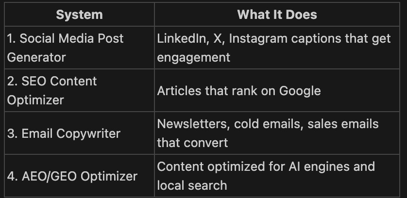 I’ve built four complete writing systems, each trained on expert-level sources, ready to generate prompts and write content.